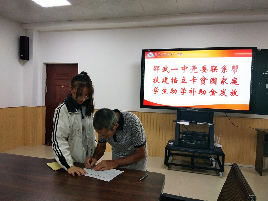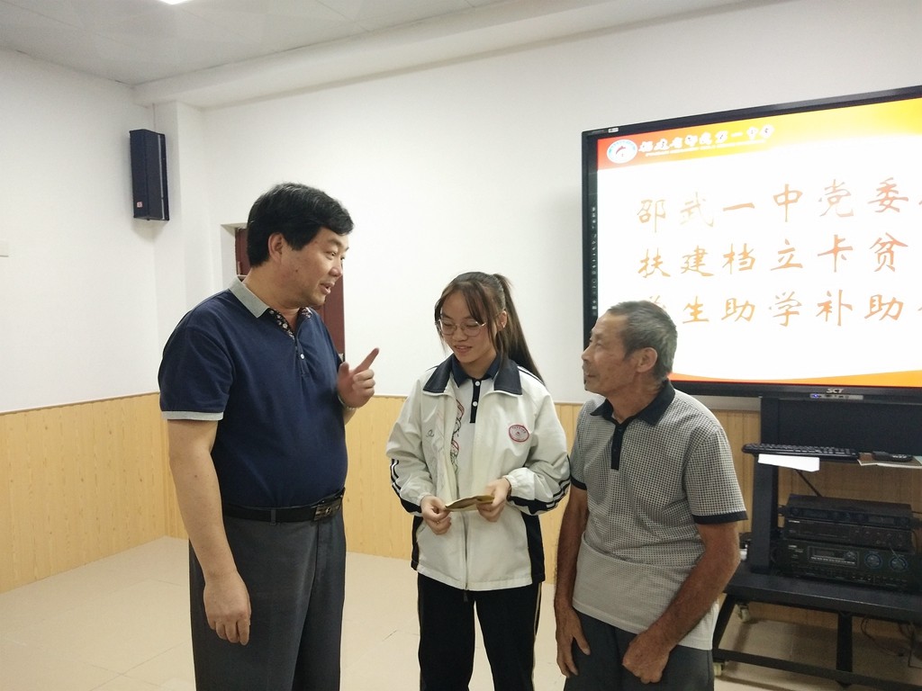2019年9月23日下午三点,校党委书记郭胜光在行政会议室主持“邵武一中党委联系帮扶建档立卡贫困家庭学生助学补助金发放”仪式,郭书记鼓励高三(6)班的受助同学黄绮萍要珍惜时间,把握机遇,好好学习,做一个对国家有贡献的人,黄绮萍以及他的家人一再表示感谢党和国家的好政策,一定会加倍努力,不辜负党和国家的培养。