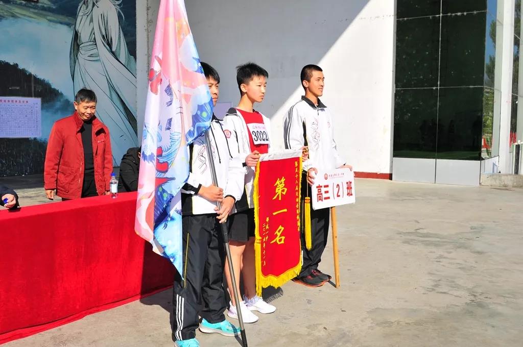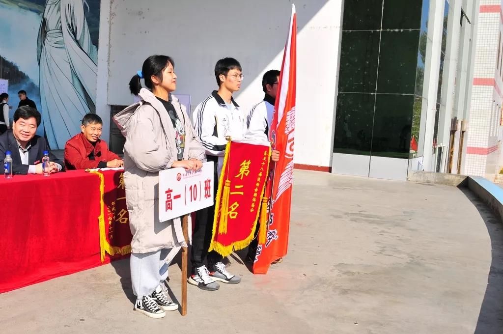 闭幕式上,郭胜光书记致闭幕词,向筹备运动会的全体老师和同学表示感谢。本次运动会的裁判长吴慧华老师宣布了比赛成绩。其中,高一(12)班、高二(1)班、高三(10)班分别获得所在年段的第一名,高三(2)班则获得了团体总分的第一名。