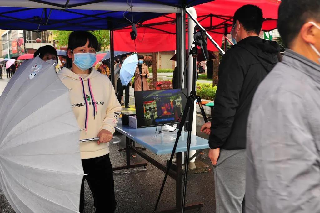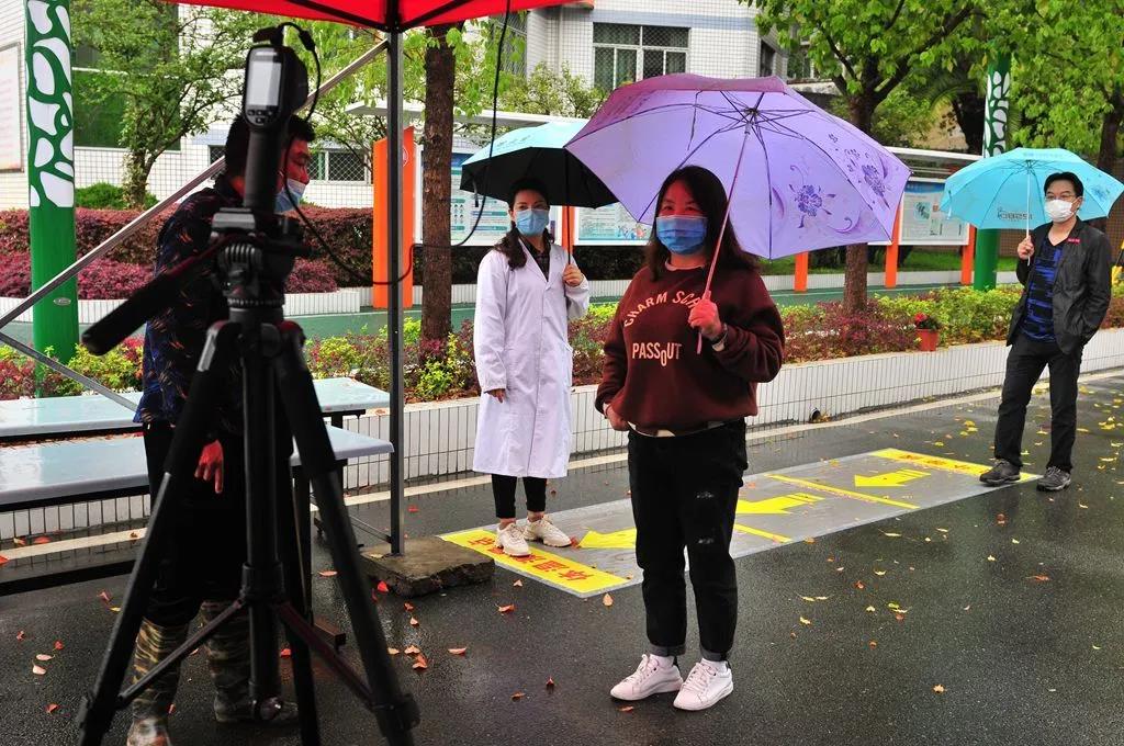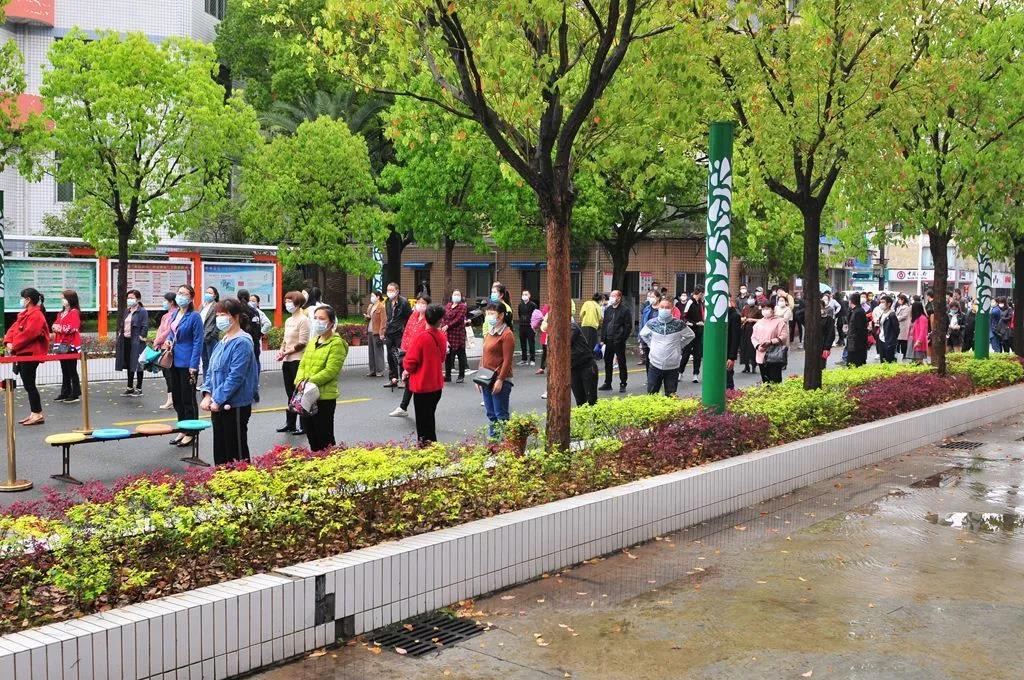 现场井然有序。在行政、安保人员的巡视、维持、疏导下,学生通道前的家长们迅速站成前后间隔1米的四列纵队,时刻提醒,避免人员交谈扎堆;测温点执勤教师能够规范、熟悉使用测温仪器进行高效、精准测量,提高了家长们入校速度,确保了演练的顺利。