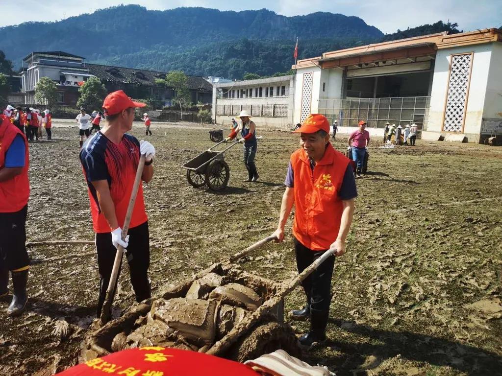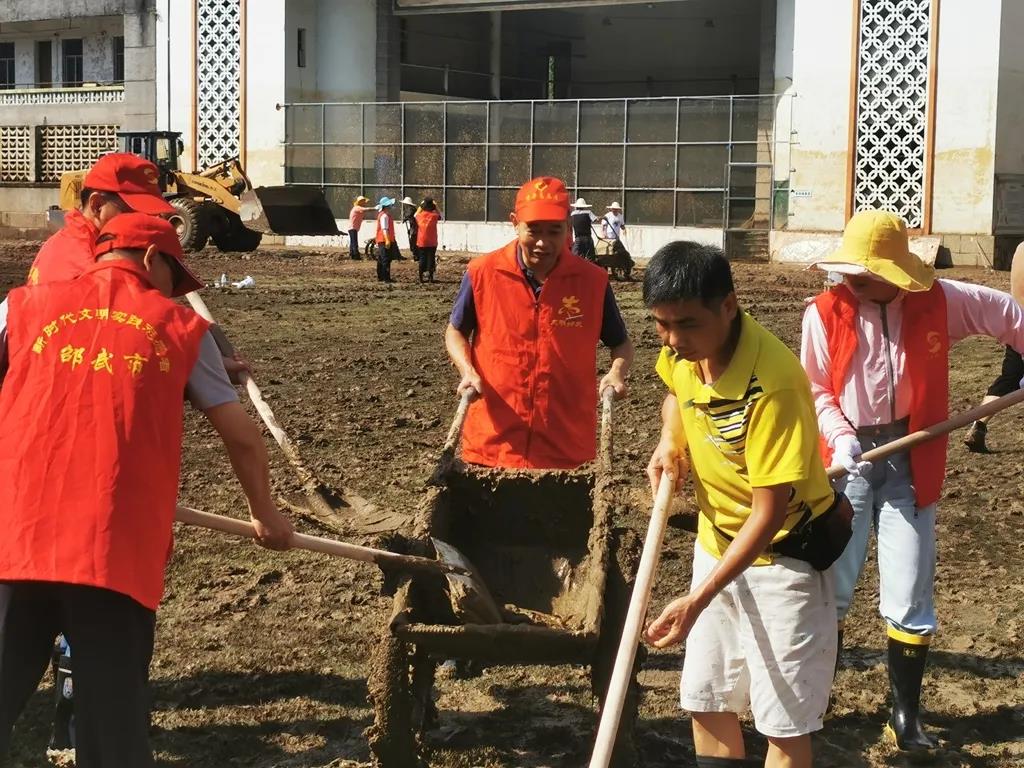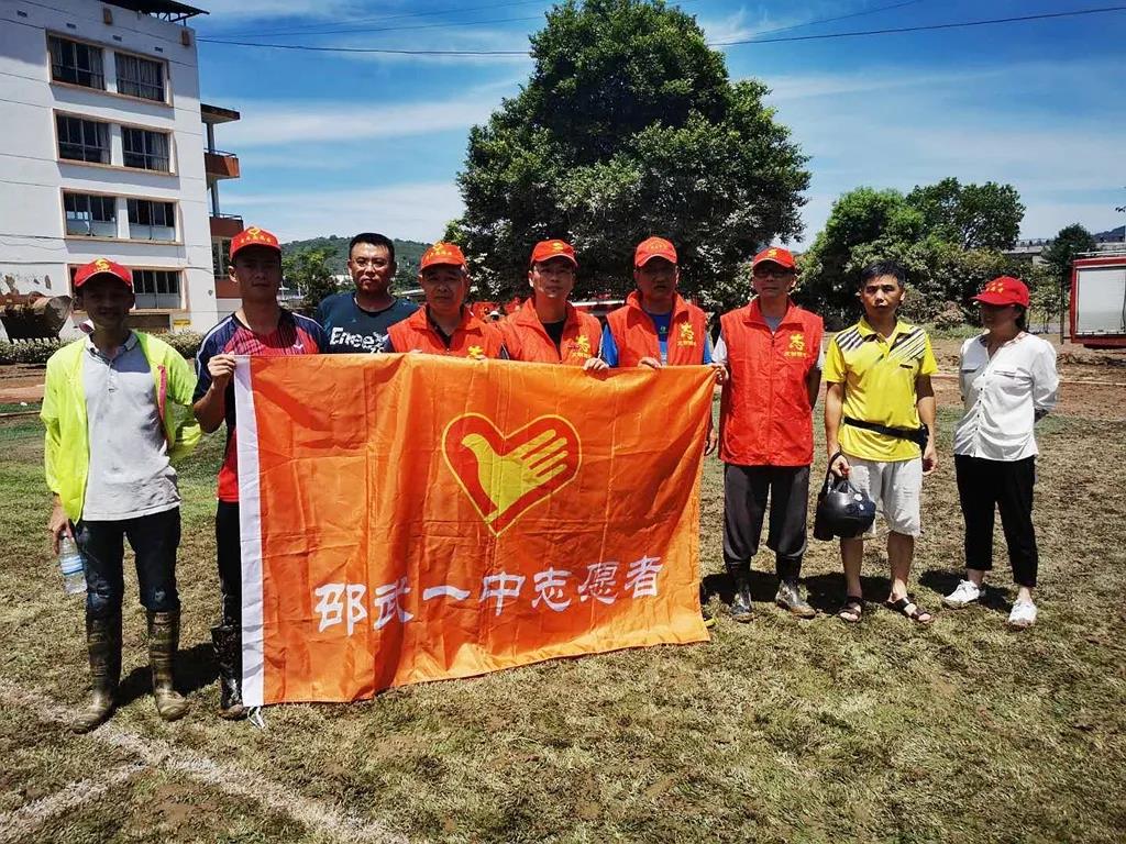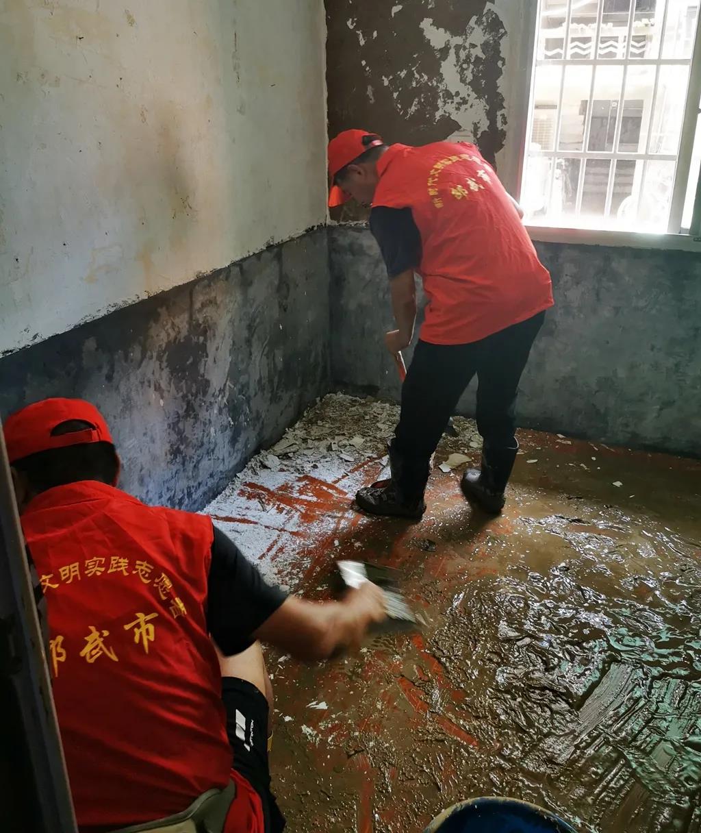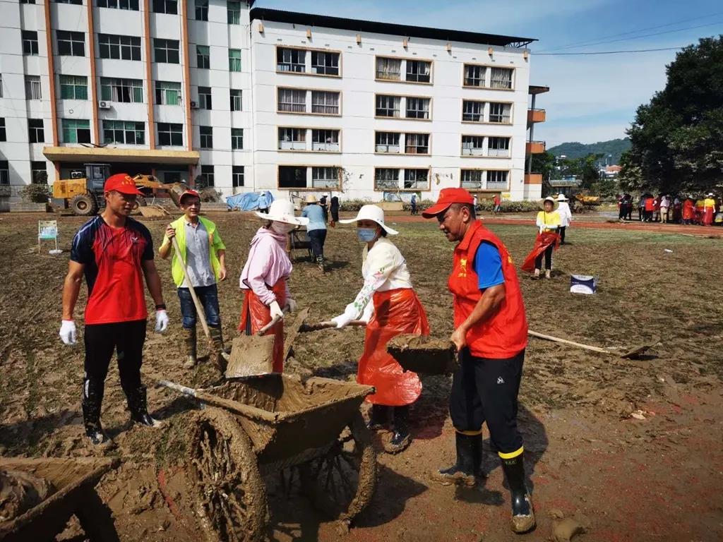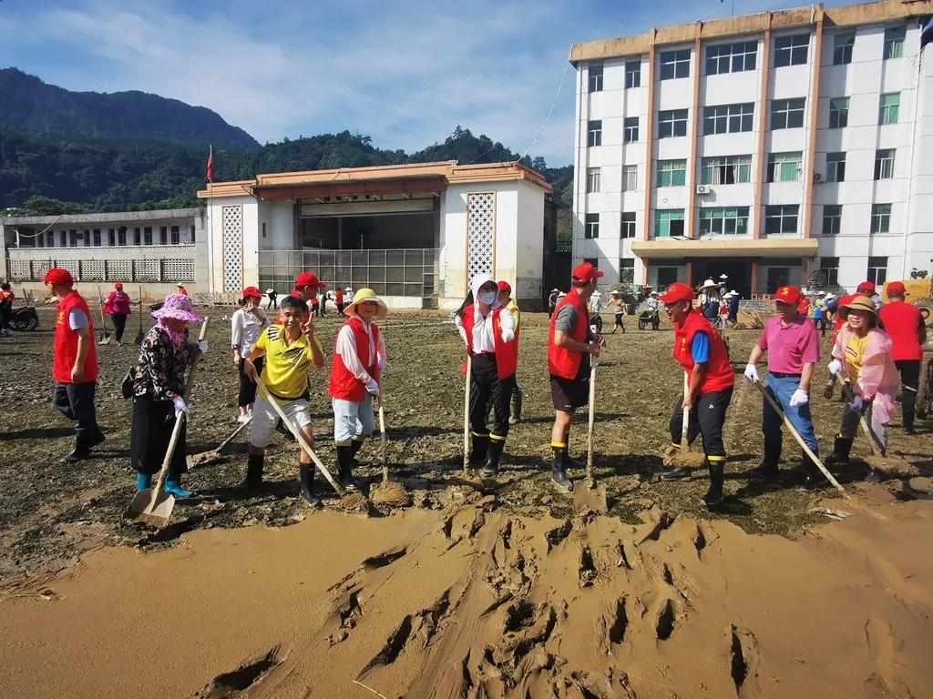 7月9日的严重内涝导致邵武市晒口善德中小学校园内部淤泥满地,为支援晒口灾后清淤工作,邵武一中吴萌校长携吴昊副校长及一中部分教师共21人,于12日上午来到善德中小学校园内,帮助清理被淤泥覆盖的操场、教室、办公室等。