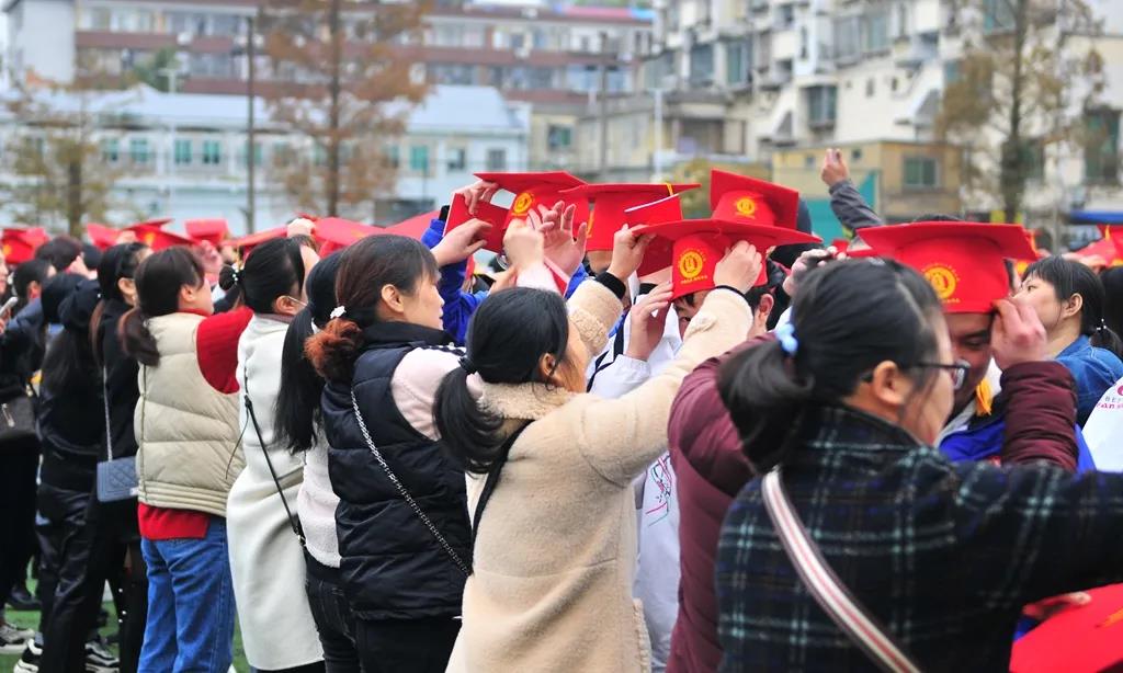 家长为孩子们佩戴成人帽