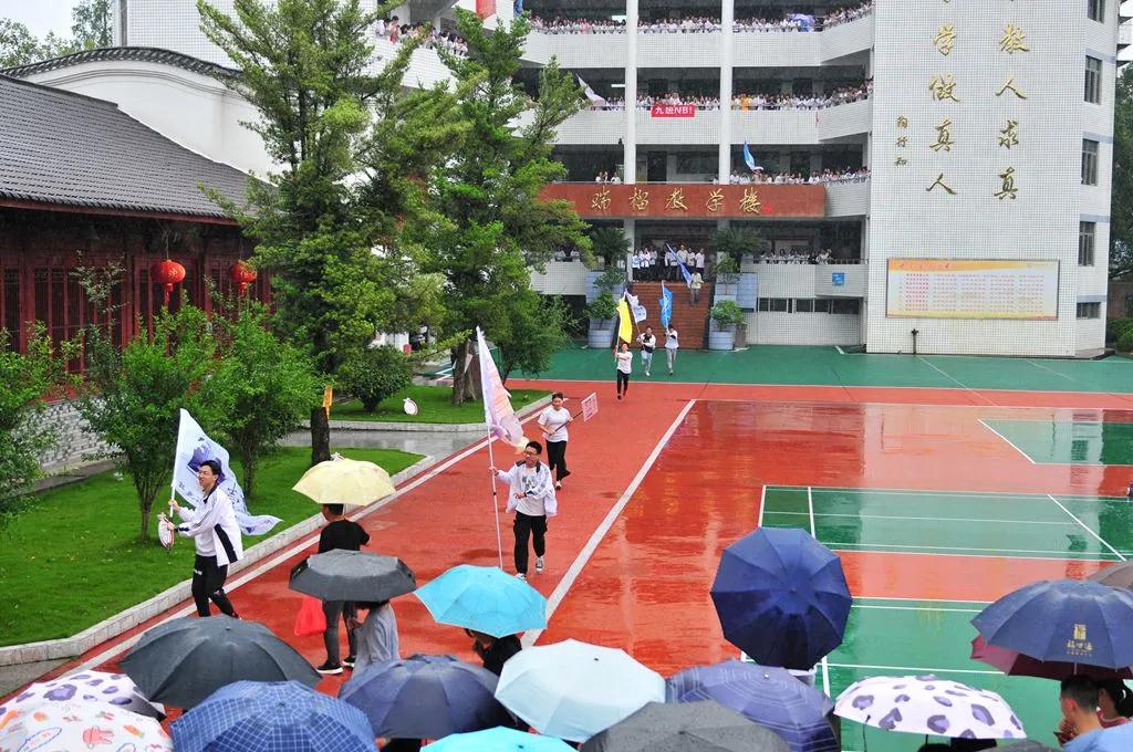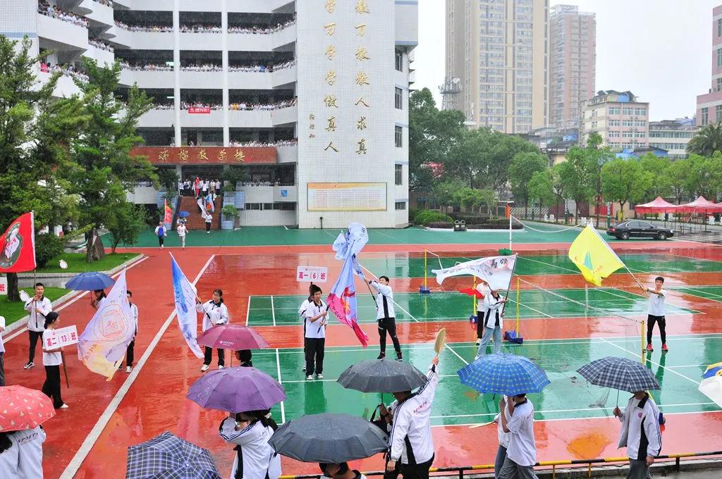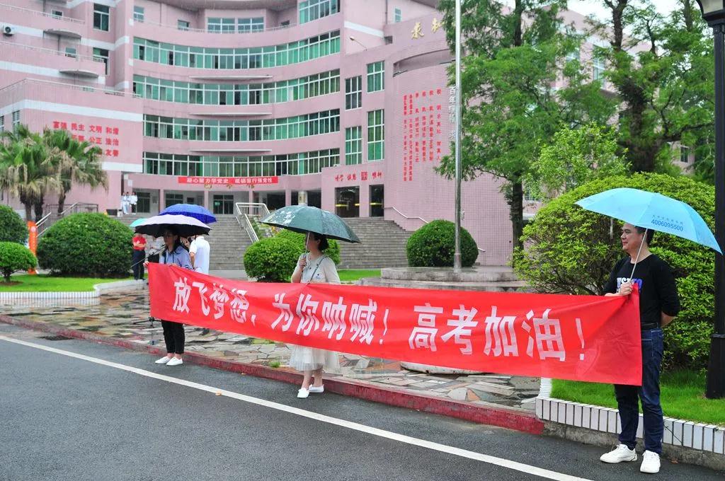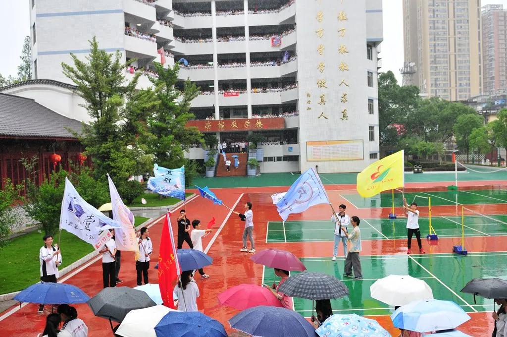 “高三加油!”“高考加油!”“十四十四,所向披靡!”……下午4点,高三方阵后传来的声声助威冲破云霄。瑞榴楼上高一高二的班旗挥舞,国旗台前高三的班旗回应,两面大鼓在雨中“养精蓄锐”,高三全体学子已经做好了出征的准备,蓄势待发。