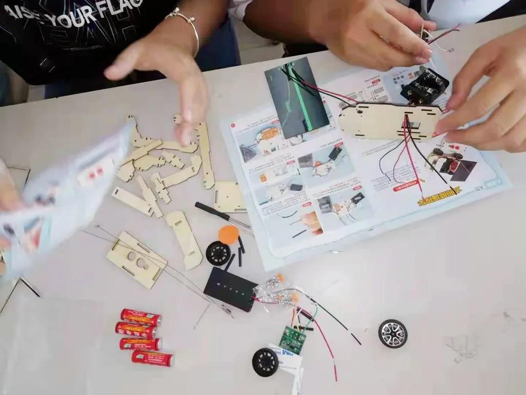 在本次组装太阳能遥控车的过程中,学生需要理论联系实际,将物理课堂上所学的机械能、光能、电能等知识与实际紧密相连,使课上课下有机地结合在一起。学生在太阳能遥控车组装时,通过观察和分析确事先进行规划,再确定具体的操作步骤。组装过程中,最重要的是将一个个精细的零部件安装在正确的位置,同时导线的连接应避免出现断路情况。学生们也遇到了一些预想不到的困难。如将两股导线的芯线绞合拧紧成单股状过程中,发现导线的芯线较短,在没有提供打火机的情况下如何操作去除芯线的绝缘层部分。如将太阳能遥控车正确组装后,发现遥控车不能正常工作,则需要重新连接电路导线排除故障。这些困难极大地考验了学生们的动手能力、细心以及耐心。面对着那一个个散乱的零件,同学们并没有选择放弃,一个个零件犹如石头般堆起。虽然小小的零件变成许多不一样的形态,但在蔡丽珍老师指导下和同学们的不懈努力,那些精细的零件像是被施了魔法,在同学们的手中渐渐成型。终于,一辆辆帅气的太阳能遥控车在阳光下驰骋。