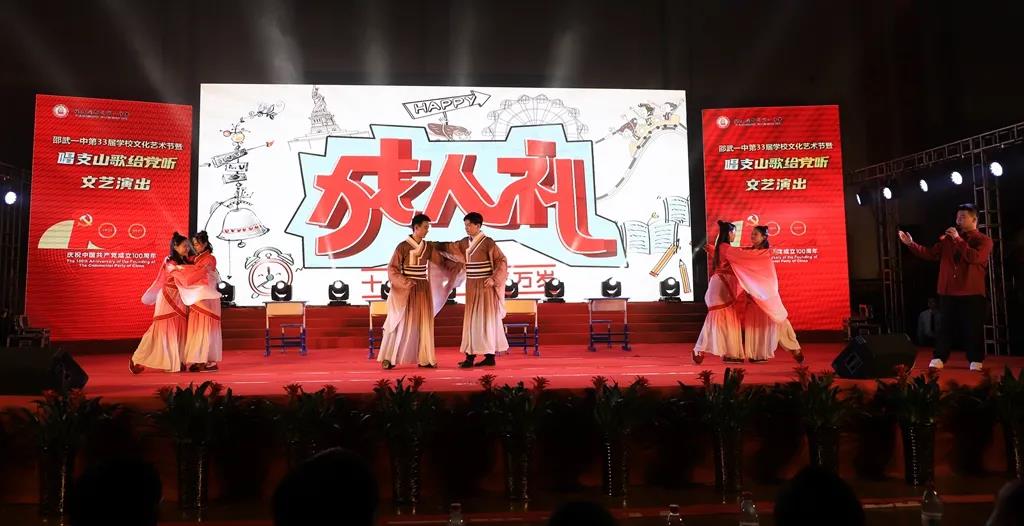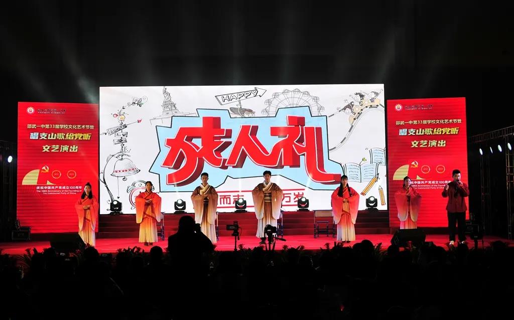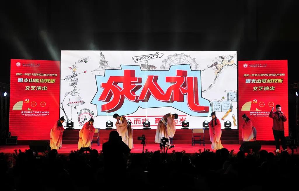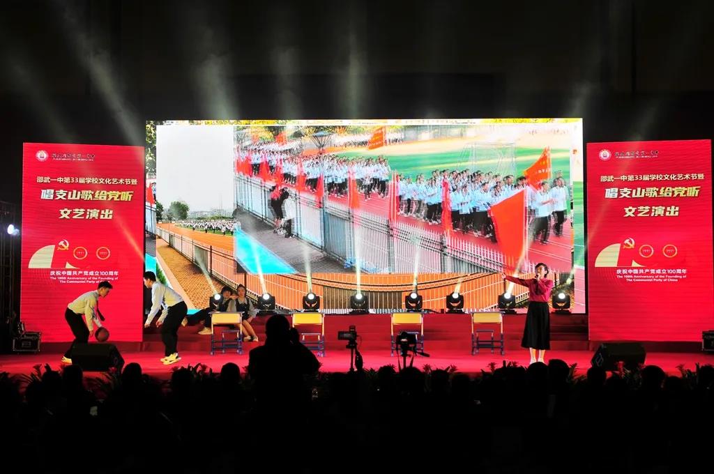 时代潮涌,征途辽阔,为庆祝中国共产党成立100周年,振奋精神,激发斗志,邵武一中于2021年12月31日,在邵武市体育馆隆重举行邵武一中第三十三届学校文化艺术节暨“唱支山歌给党听”文艺演出。市委宣传部、市教育局、文化体育和旅游、育才教育发展基金会等单位领导、挂校责任督学、综治副校长、驻邵部队共建单位首长、家委代表等嘉宾应邀出席本次艺术节文艺演出。