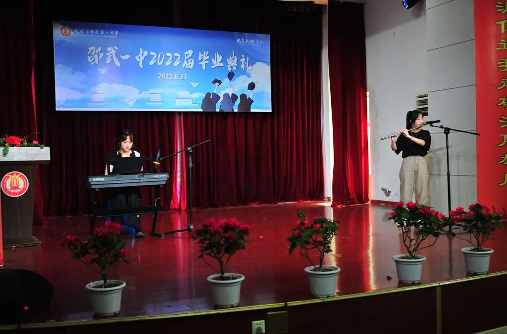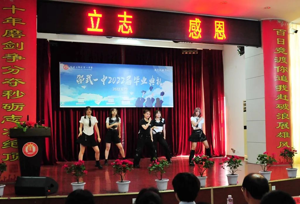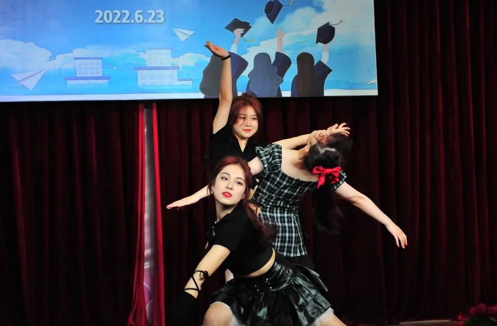 典礼上,有心潮澎湃的真情流露,也有唤醒感官的视听盛宴。同学们通过多种形式展现2022届毕业生风采。女生表演《Tomboy》、《LOCO》等劲歌热舞,活力四射;乐器合奏《大鱼》+《乘风》典雅悠扬,展示了一中学子多才多艺的一面。刘海洋、吴垚滔两位同学分别演唱了《不说再见》、《那些花儿》,风采不凡,极具亲和力。他们亲手剪辑的视频更是锦上添花,唤起师生们的深情回忆,是对“时光不老,我们不散”的最好诠释。