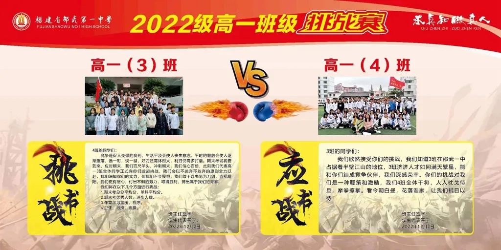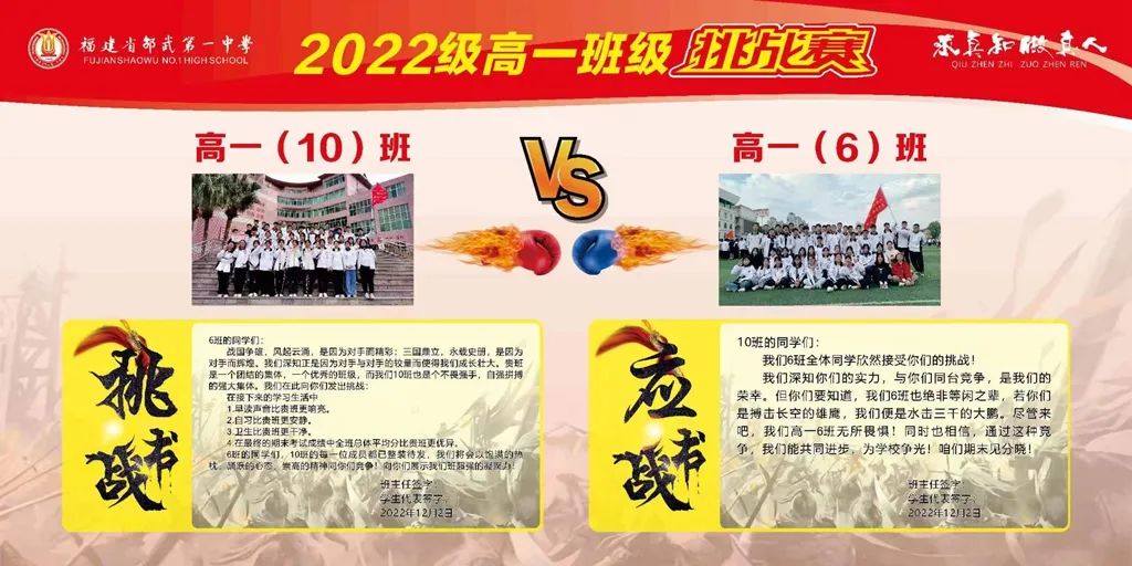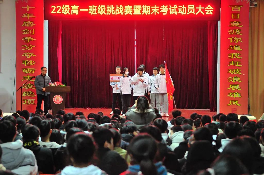 首先由温暖宁段长宣读班级挑战的规则和意义,随后高一3班、10班、13班依次发起挑战,高一4班、6班、14班积极应战。参加挑战赛的班级纷纷派代表上台,高举班牌和班旗,斗志昂扬地宣读了自己的挑战书和应战书。台上班级代表字字铿锵,台下学子豪气干云,他们用坚定的声音传递挑战的决心与迎战的勇气。交换的战书是奋战的誓言,更是如火青春的深刻印记。以比赛促进学习,以竞争提升成绩。此外,6个班的班主任们也上台为自己的班级鼓舞士气,加油助威。在一阵阵热血沸腾的呐喊中,现场气氛推向高潮,同学们脸上的坚毅与勇敢,彰显了勇者无畏的决心!