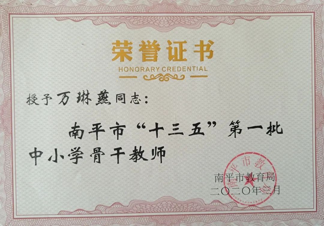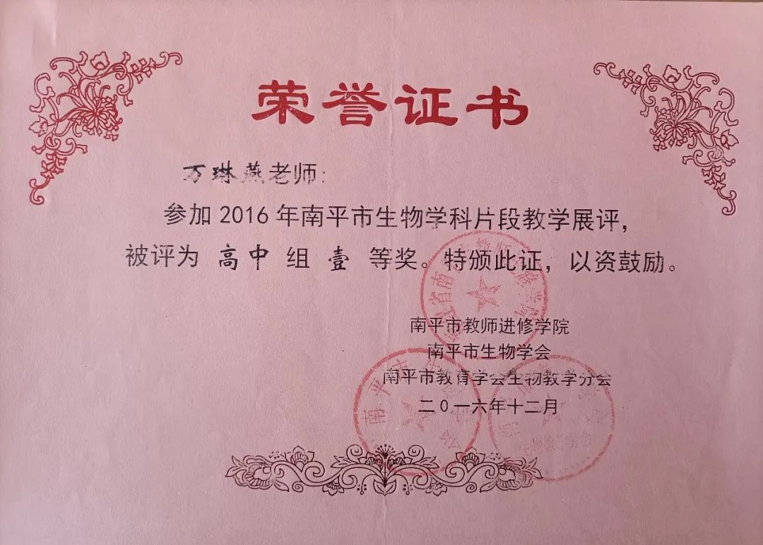 万琳燕老师,邵武一中生物高级教师,南平市骨干教师。从教20年,担任了14年班主任、8年生物组教研组长、11年备课组长,长期以来,工作中模范履行职责、兢兢业业、勤于钻研、勇于创新,各项成绩突出,赢得了学校、家长和社会的一致好评。