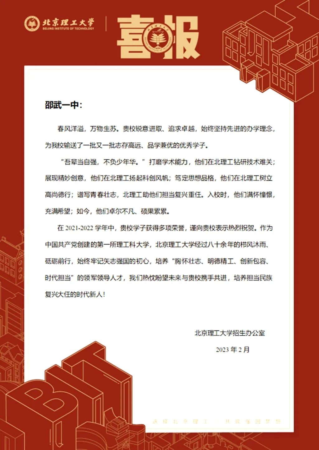 荣耀一中 | 北京理工大学为我校发来喜报!