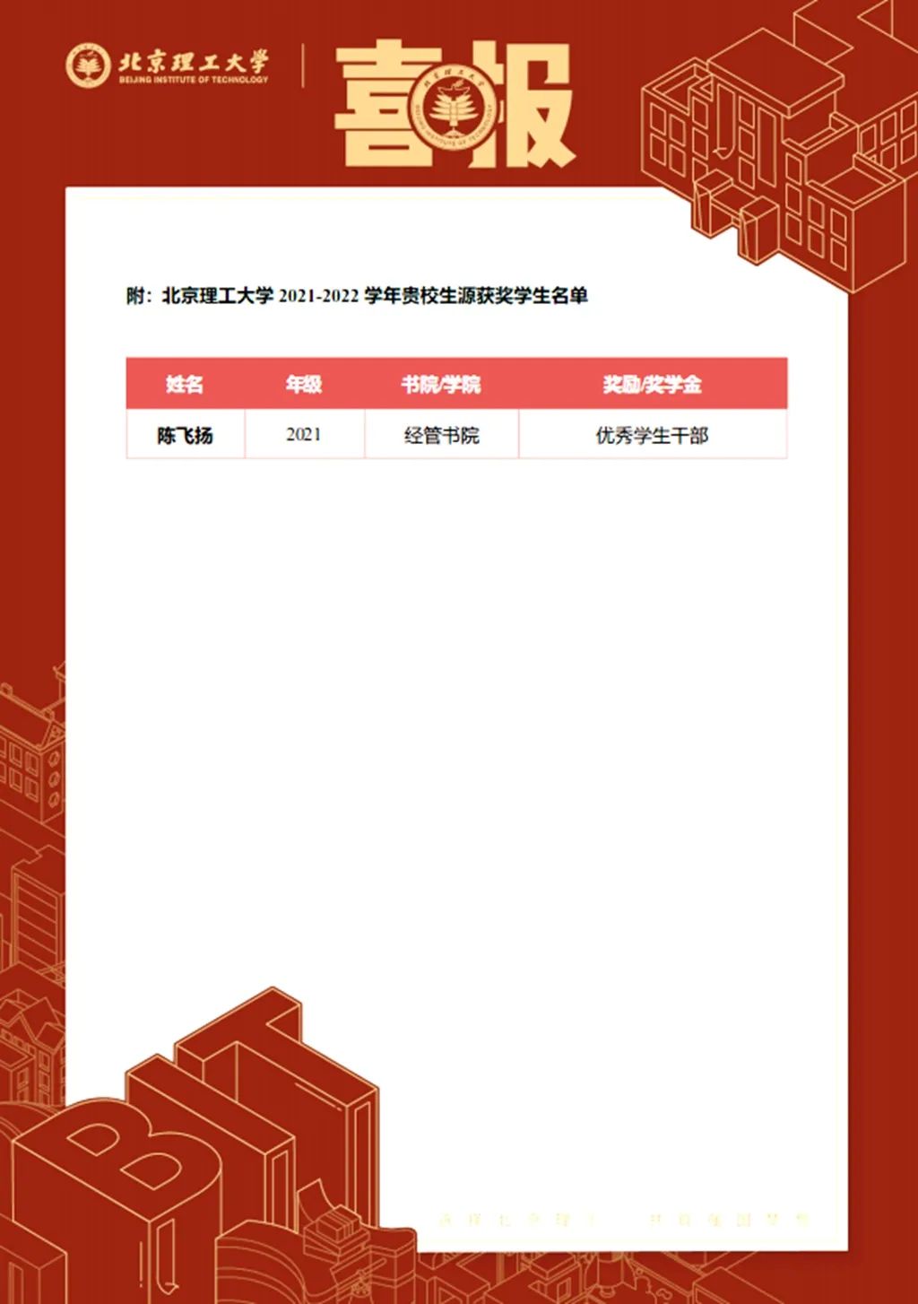 喜报:邵武一中2021届毕业生陈飞扬同学荣获北京理工大学经管书院优秀学生干部奖。