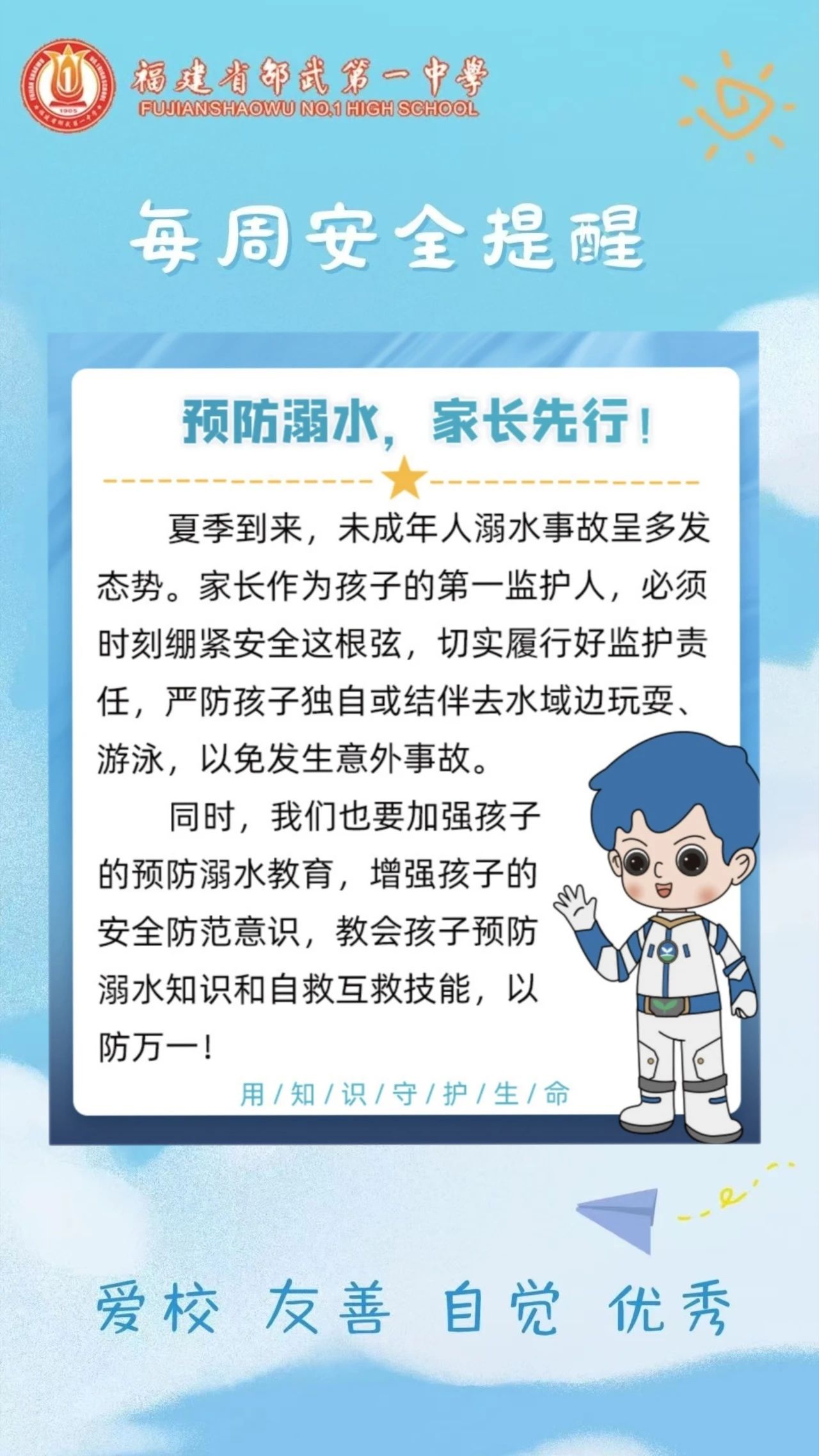 发布“防灾减灾”安全提醒,推送至各班级家长群,升旗仪式下学生代表做“防灾减灾”主题演讲,进一步提升了大家防灾减灾意识。