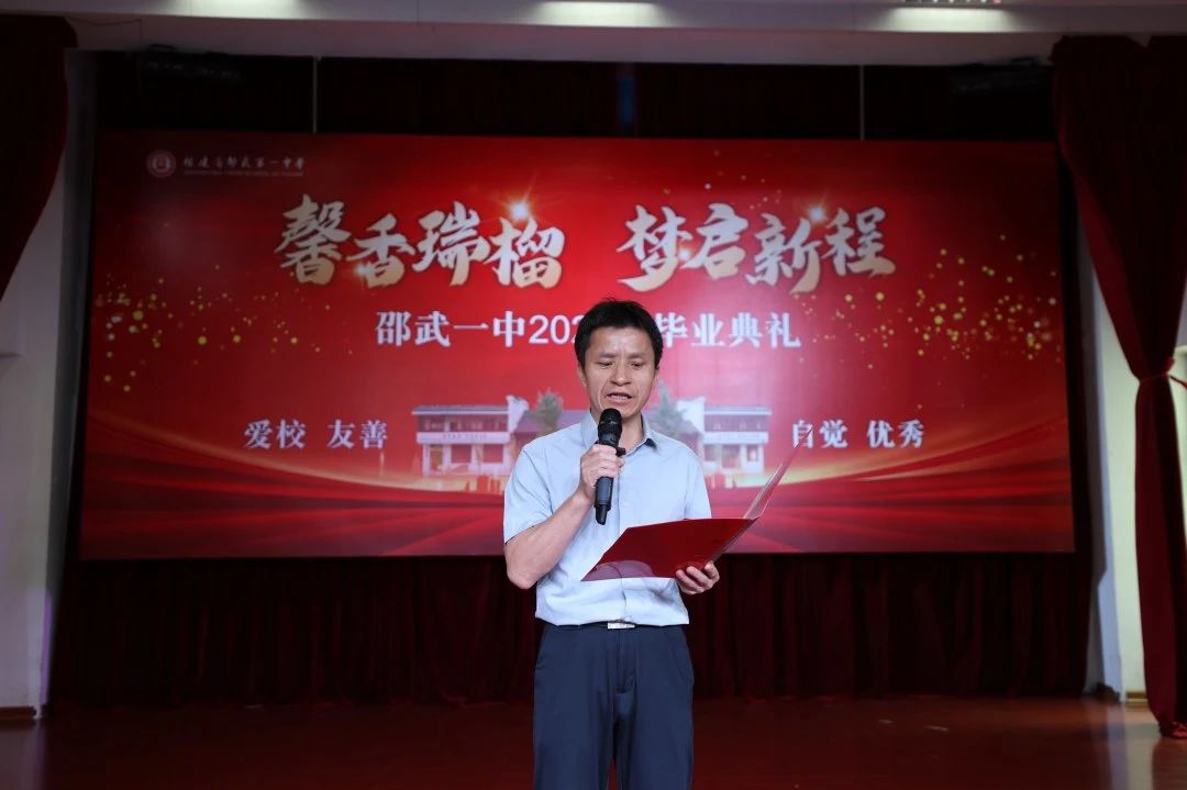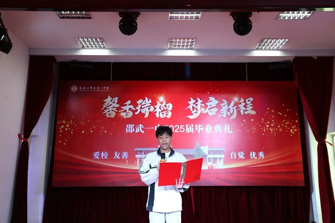 余国辉校长深情致辞,向同学们送上了殷切的祝福与期许,他寄语毕业生:带走一中人的“较真劲”、“热乎心”、“敢拼敢闯”的实干精神,书写一中的蓬勃新篇!并为毕业生及母校邵武一中百廿华诞献上诗篇: