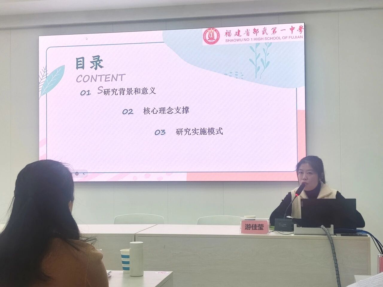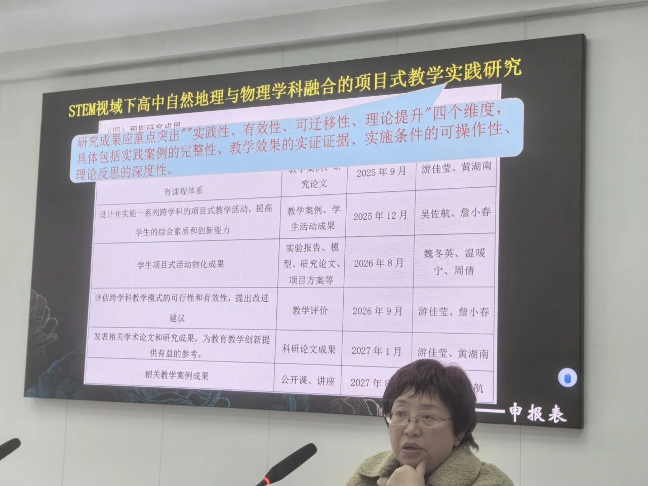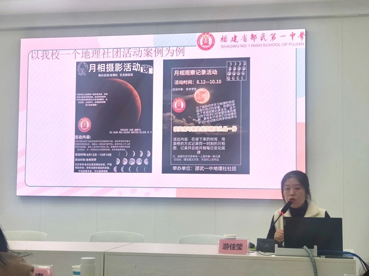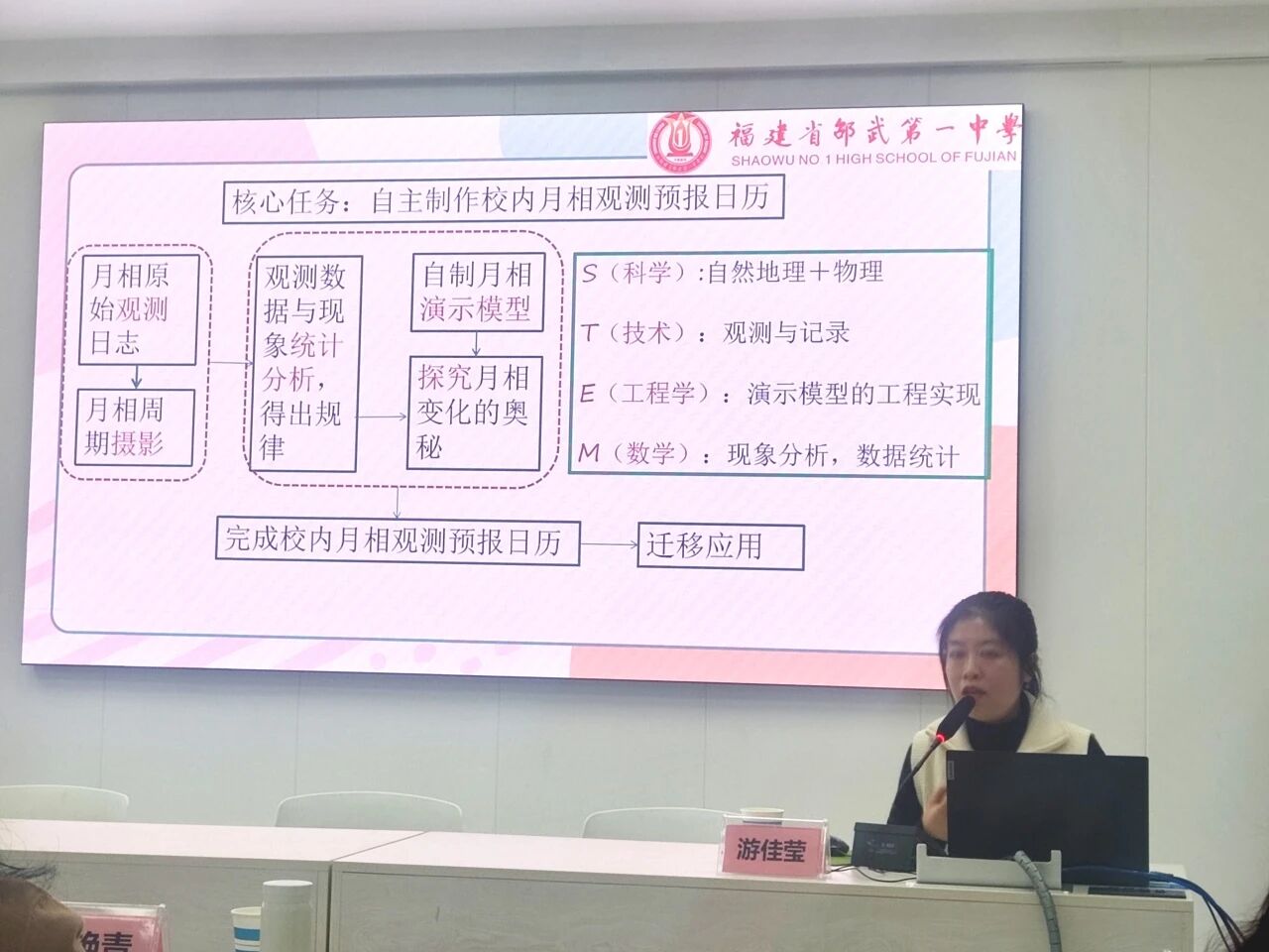 汇报环节,游佳莹老师紧扣 STEM 教育理念,从研究背景与意义、核心理念支撑、研究实施路径三大维度展开详实阐述。汇报立足时代需求、政策引领等四大研究动因,在课题校内指导专家许俊斌老师、严红玉老师的指导下明确自然地理与物理学科融合的核心知识支点,剖析跨学科教学痛点,并以邵武一中地理社团月相观察活动的升级为案例,系统规划了可落地的跨学科项目,研究思路清晰、实操性极强。