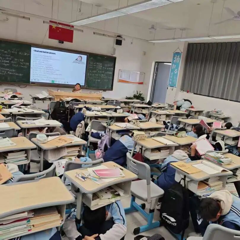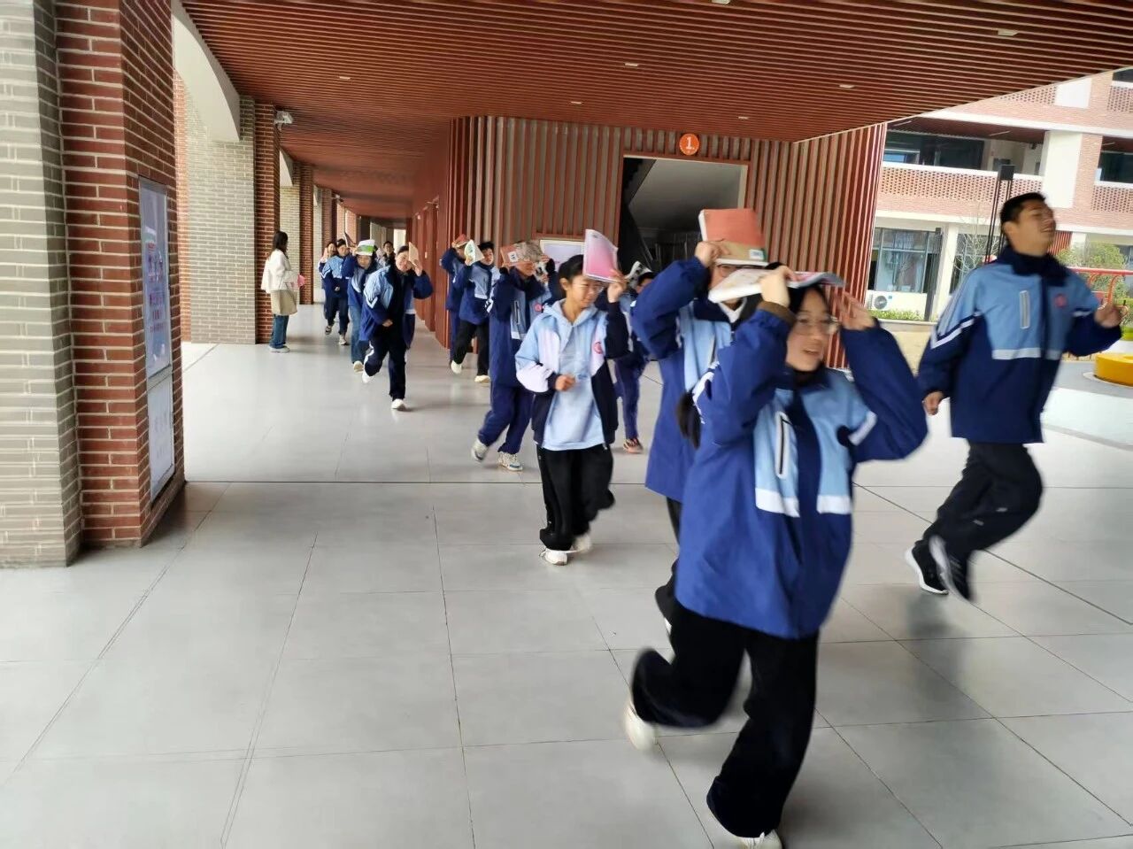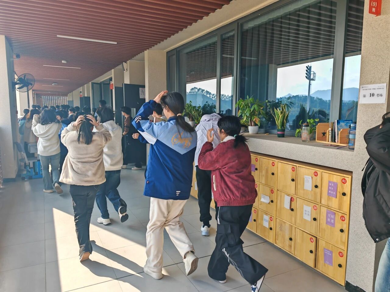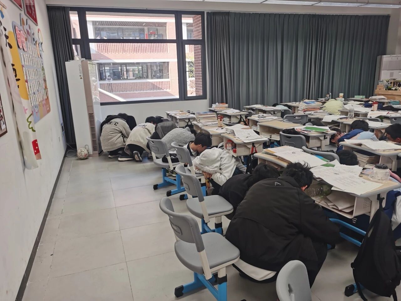 15:50,地震警报准时拉响,全校师生即刻开展避险行动,就近躲至课桌下方、墙角等安全区域,并用书包、书本护住头部,动作标准统一,应急反应能力出色。