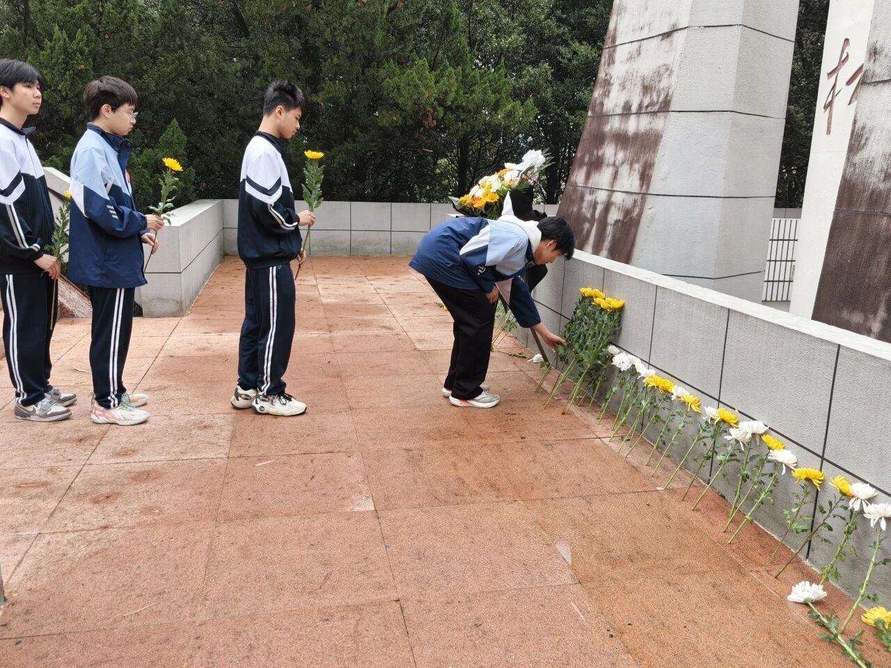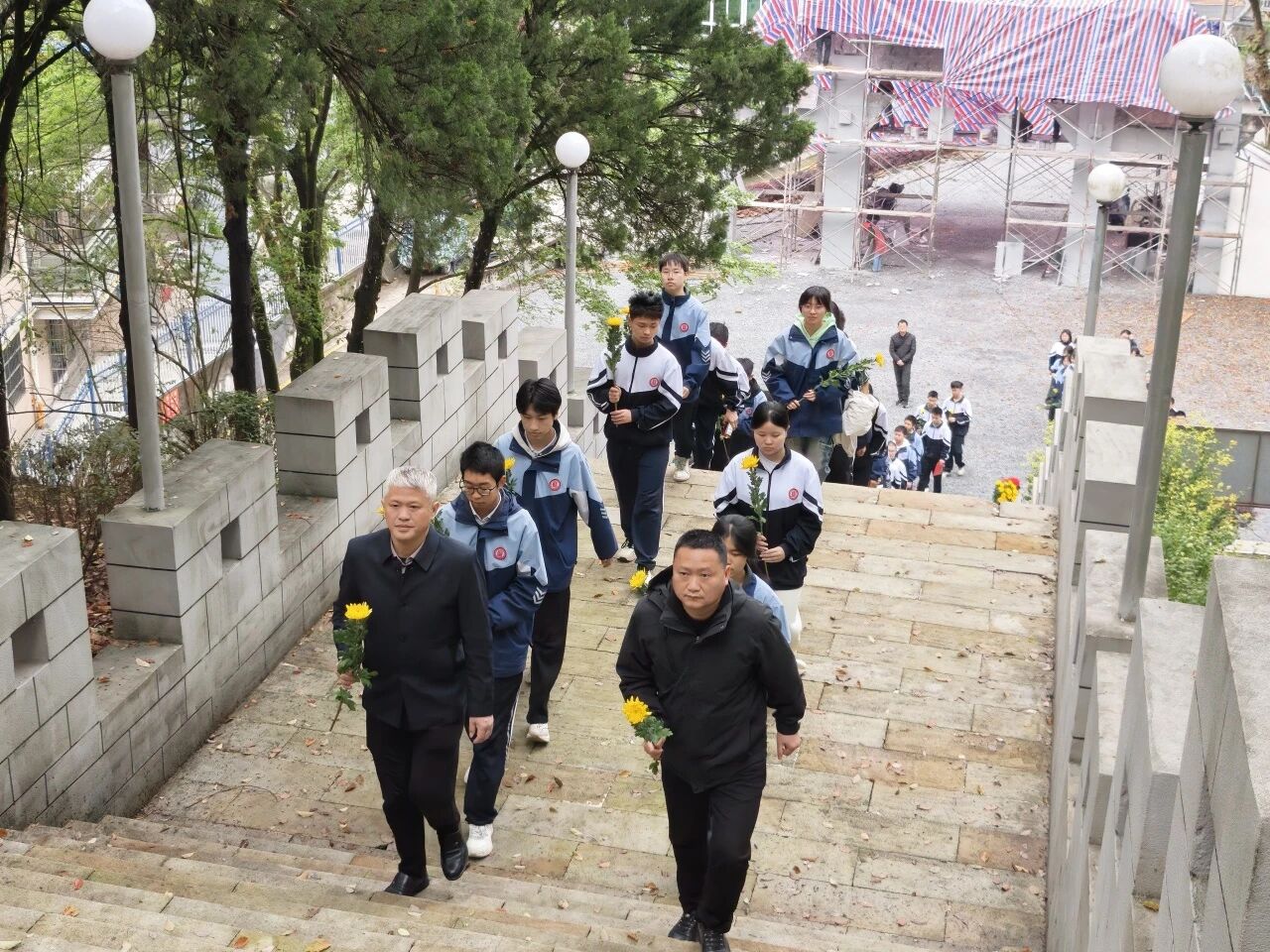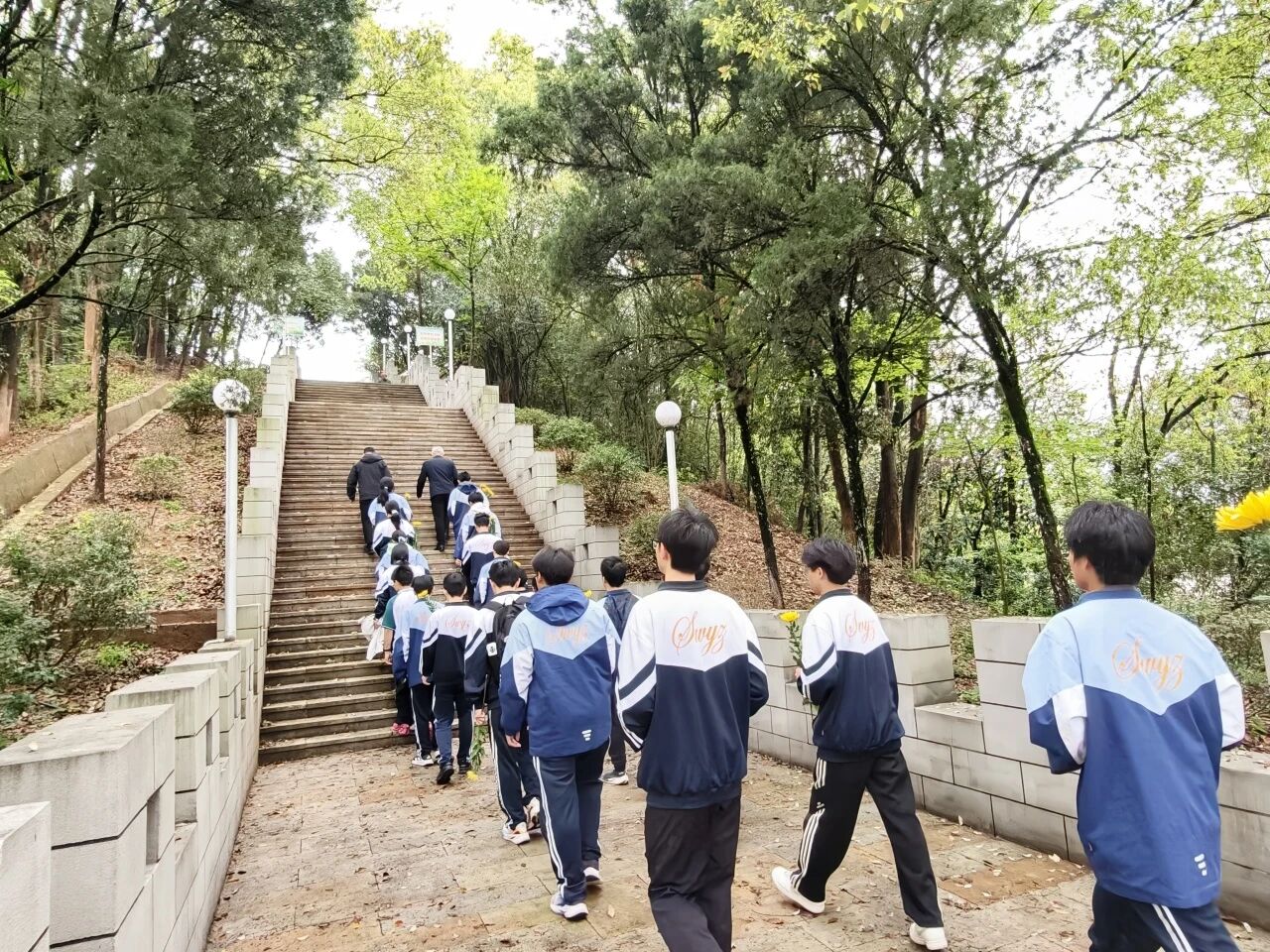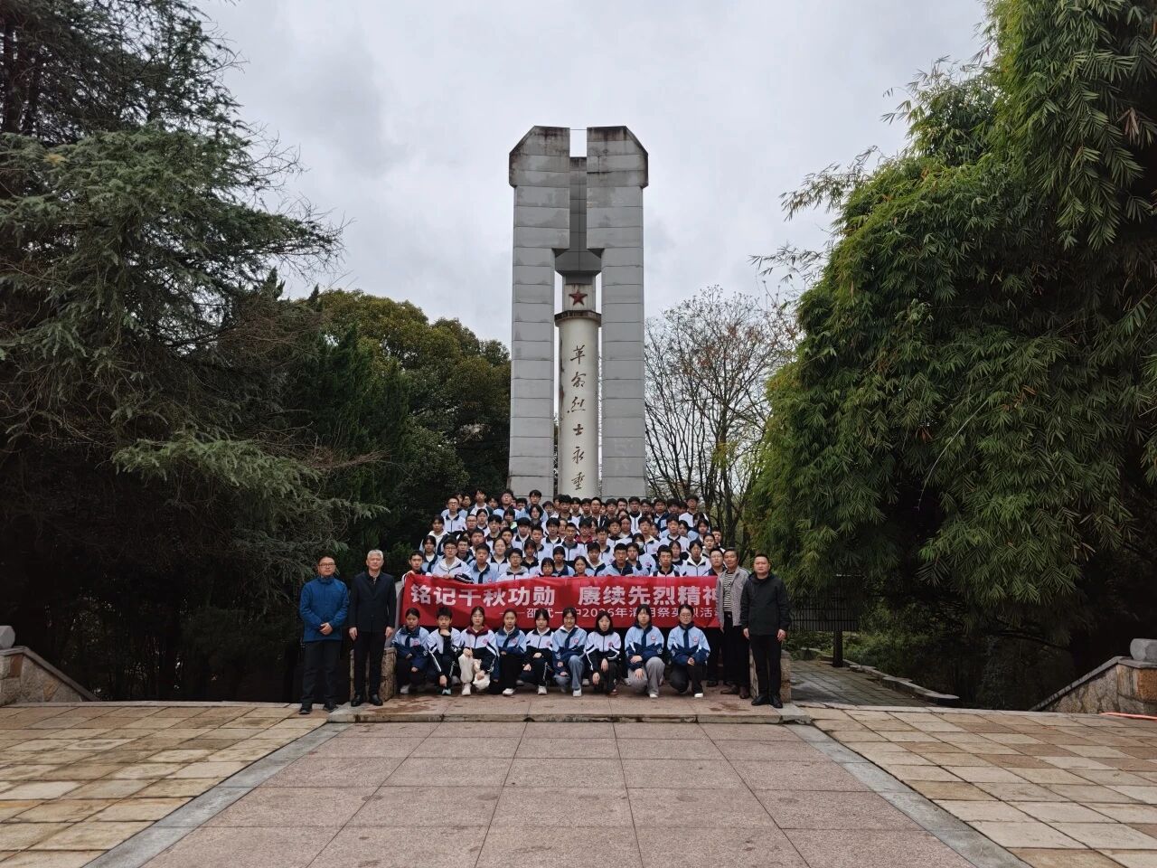 仪式尾声,全体师生在纪念碑前合影留念。一张张青春的脸庞坚定而庄重,那是信仰的传承,也是未来的希望。随后,队伍有序离场。来时脚步沉重,归时心中明亮——这不仅是一次祭扫,更是一堂行走的思政课,一次心灵的洗礼。