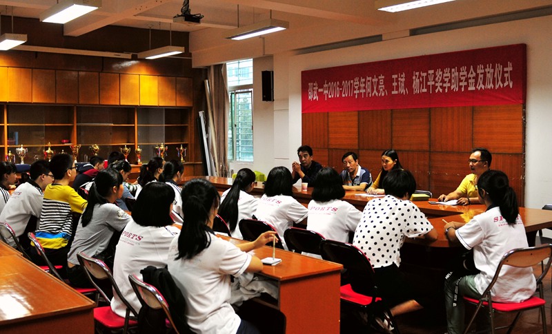 19日下午,一中在校行政会议室举行2016-2017学年何文亮、王斌、杨江平奖助学金发放仪式。该奖助学金自2010年开始每年出资30000元奖助我校20名品学兼优家境困难的同学。仪式由政教处陈丹主任主持。