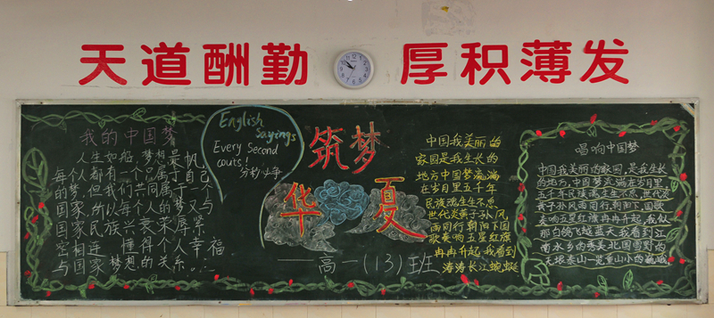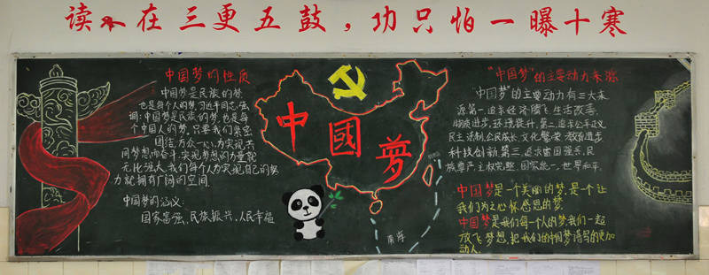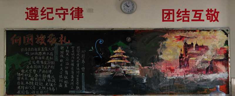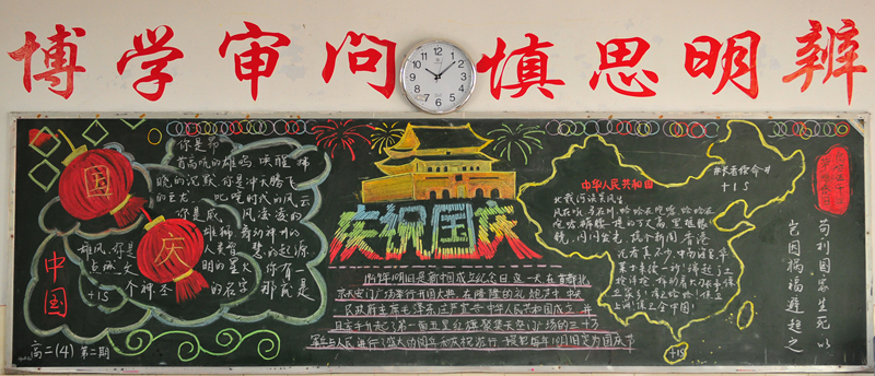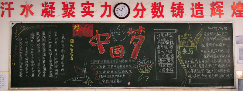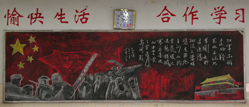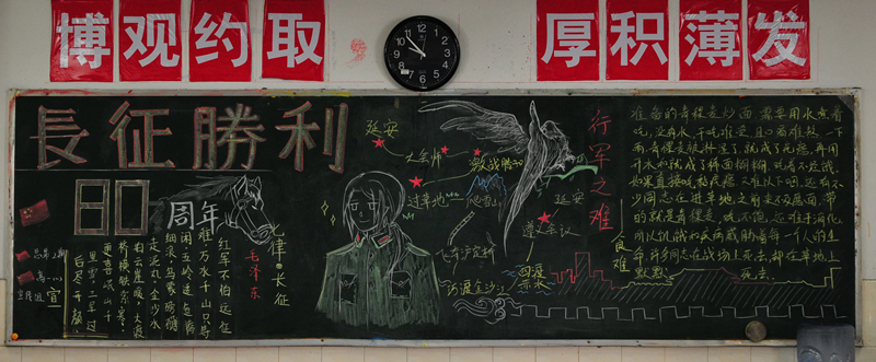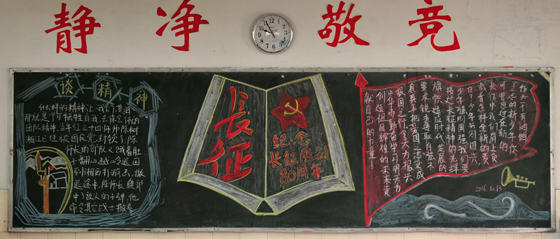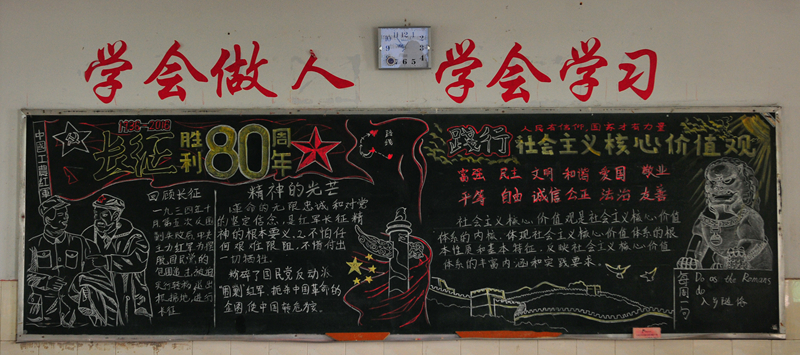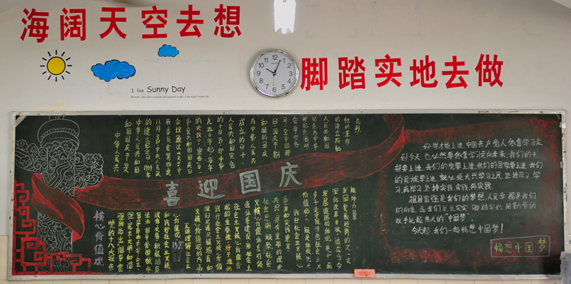 10月份黑板报评比活动已经结束。各个班级都围绕着“国庆”、“社会主义核心价值观”及“纪念红军长征胜利80周年”的主题进行了自己的大胆尝试与创意发挥。大部分黑板报图文并茂,花样迭出,有声有色,把每一个学生心中的中国梦描绘得淋漓尽致,实乃校园里一道道充满着爱国情怀的风景线。