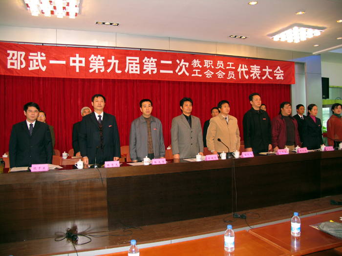 11月20日,邵武一中在校教工会议室召开第九届第二次教工代表大会。邵武市总工会主席陈九生,市教育局党委书记吴建华出席了大会并发表谈话。本次教代会的主要议程有:范纯善校长作《学校工作报告》,张光华书记作《五年规划报告》,林普光主席作《工会工作报告》,吴凯民主任作《岗位补贴实施办法》专题议案报告,饶干东主任作《财务管理工作报告》,郭文玉副主席作《关于上次教代会提案落实及本次提案征集的处理情况报告》,提案解答、民主评议校领导干部、分组讨论报告和议案、主席团会议、议案表决等。