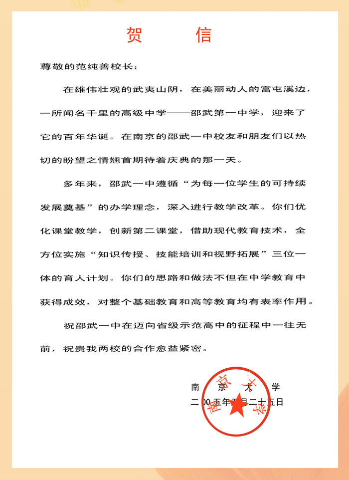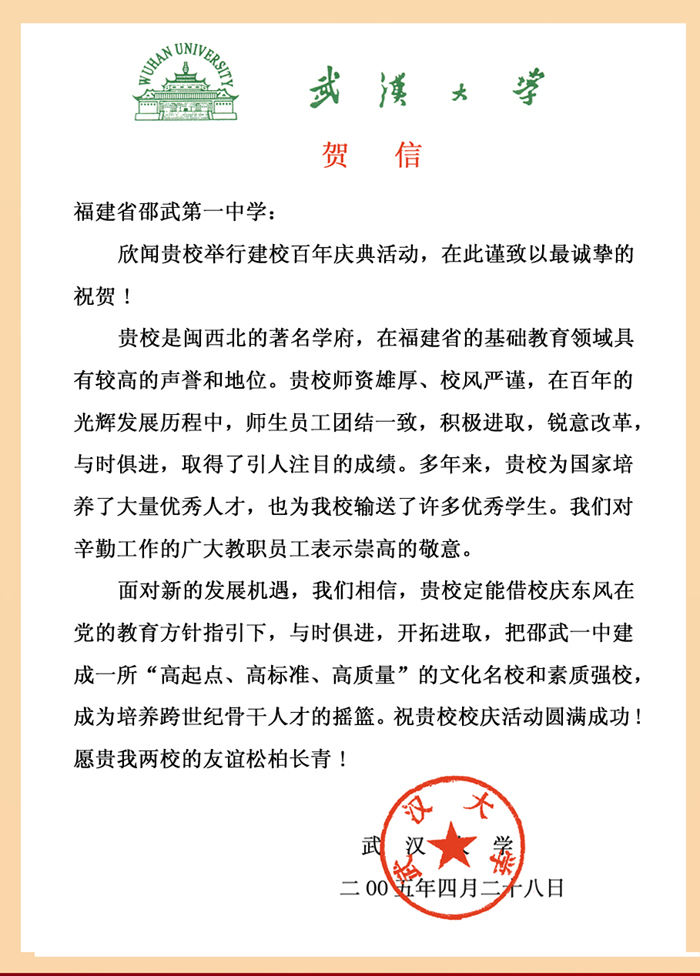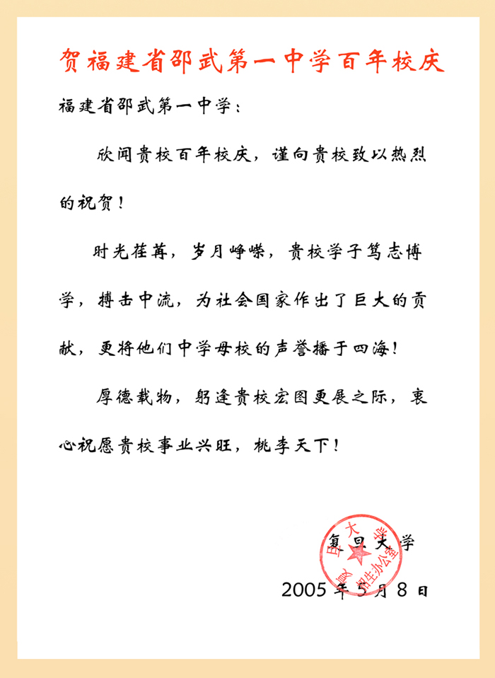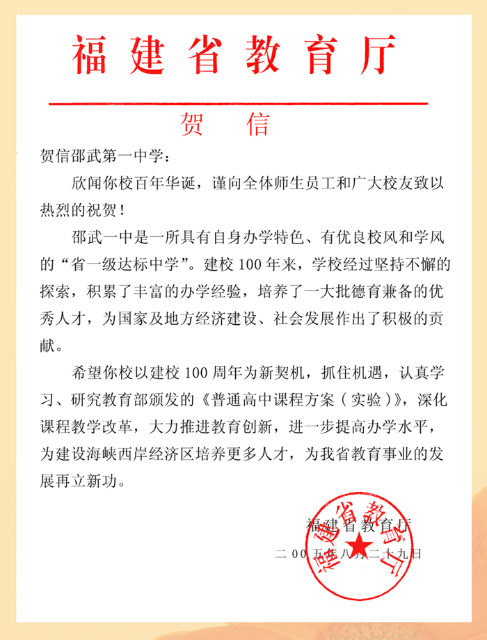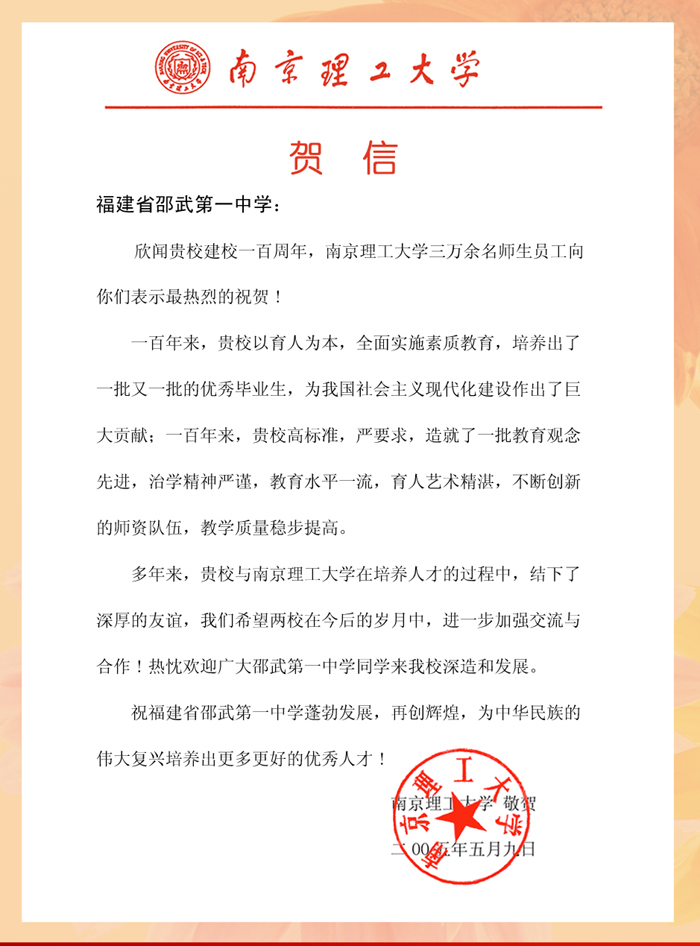 学校简介 领导班子 组织机构 校园风光 学校荣誉 一中校歌 百年华诞高校贺信 作者:jhs 来源:本站原创 日期:2005-09-19 人气:21801 上一篇:邵武一中学校发展目标与文化精神 下一篇:百年华诞高校校长题词 通知公告 更多 【瑞榴 • 公告】2026年福建省邵武... 【瑞榴 • 公告】2026年福建省邵武... 【瑞榴 • 公告】2026年邵武一中第... 【瑞榴 • 公告】2026年邵武一中自... 【瑞榴 • 公告】2026年福建省邵武... 【瑞榴 • 公告】2026年福建省邵武... 最新动态 更多 【瑞榴 • 社团活动】传承非遗文脉... 【瑞榴 • 优秀校友】情系母校 反... 【瑞榴 • 安全】筑牢安全防线,... 【瑞榴 • 团建】铭记千秋功勋,... 【瑞榴 • 社团活动】暖心相伴,... 【瑞榴 • 学生活动】千年傩舞进校... 【瑞榴 • 教研】研思共进,赋能课... 【瑞榴 • 党建】“党纪铸魂守初心... 【瑞榴 • 近视防控】瑞榴润心 守... 【瑞榴 • 安全】防毒护苗,青春无...