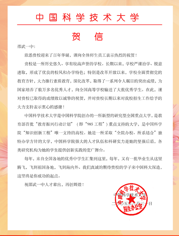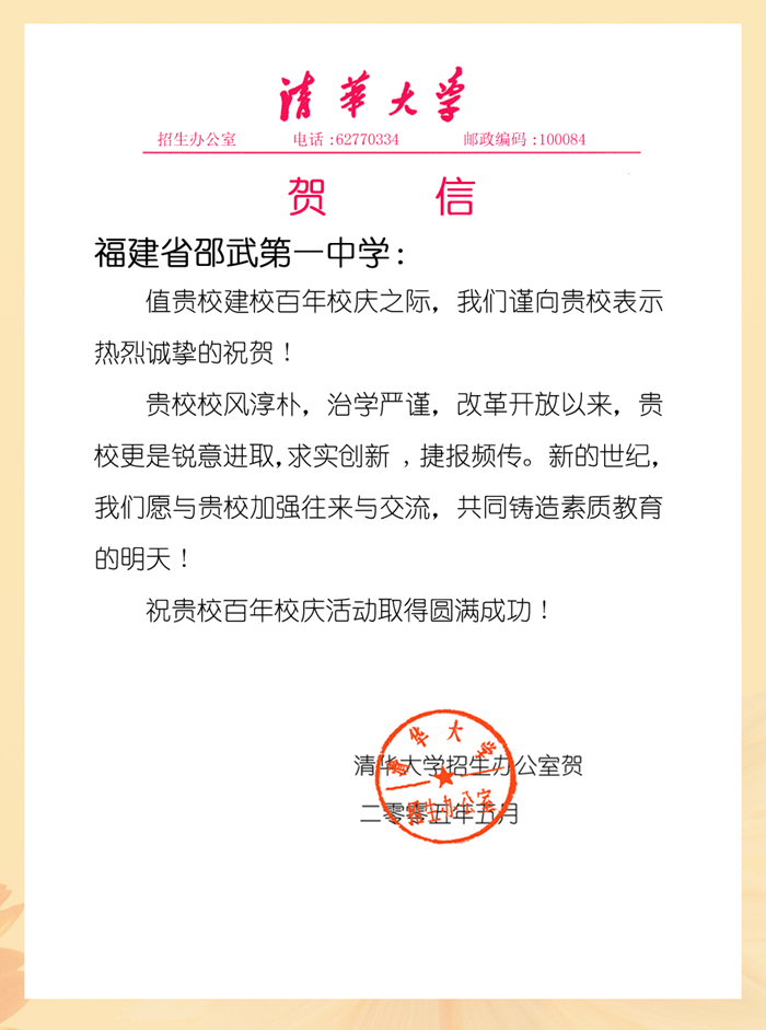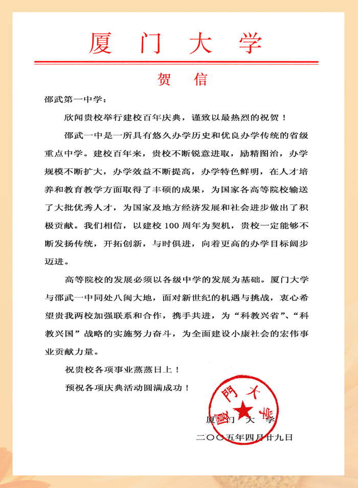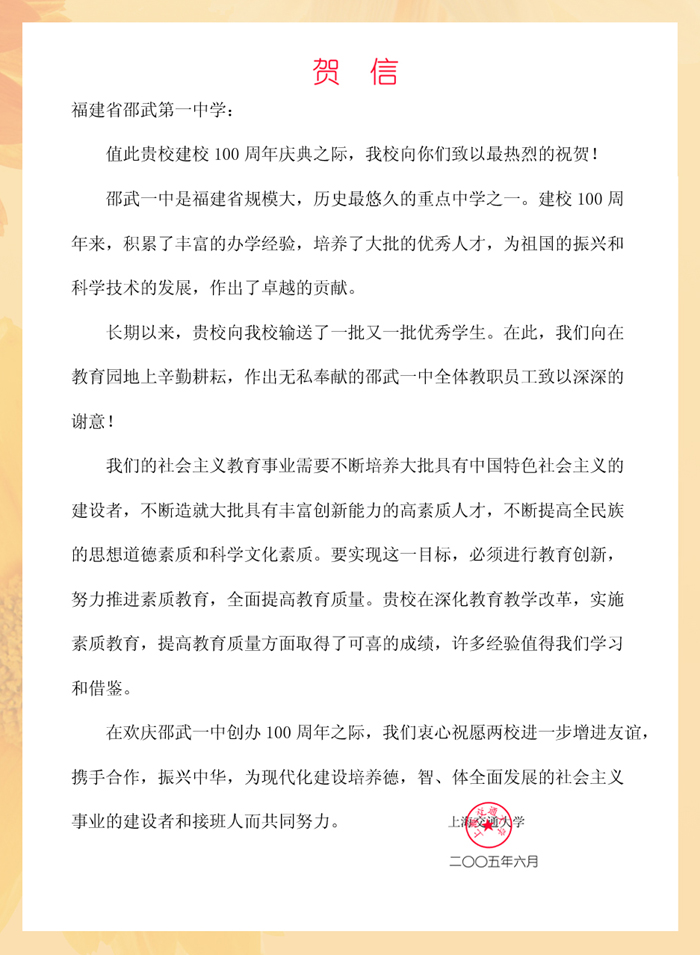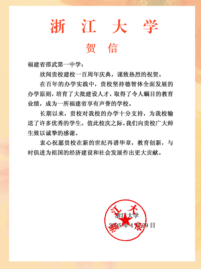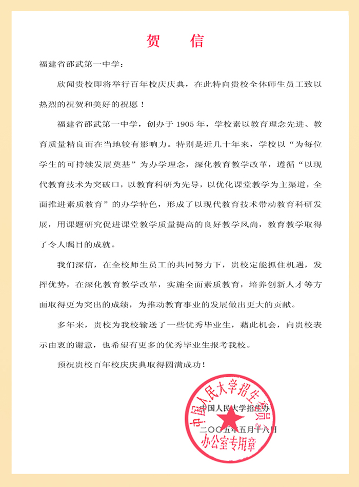 学校简介 领导班子 组织机构 校园风光 学校荣誉 一中校歌 百年华诞高校贺信 作者:jhs 来源:本站原创 日期:2005-09-19 人气:21801 上一篇:邵武一中学校发展目标与文化精神 下一篇:百年华诞高校校长题词 通知公告 更多 【瑞榴 • 公告】2026年福建省邵武... 【瑞榴 • 公告】2026年福建省邵武... 【瑞榴 • 公告】2026年邵武一中第... 【瑞榴 • 公告】2026年邵武一中自... 【瑞榴 • 公告】2026年福建省邵武... 【瑞榴 • 公告】2026年福建省邵武... 最新动态 更多 【瑞榴 • 社团活动】传承非遗文脉... 【瑞榴 • 优秀校友】情系母校 反... 【瑞榴 • 安全】筑牢安全防线,... 【瑞榴 • 团建】铭记千秋功勋,... 【瑞榴 • 社团活动】暖心相伴,... 【瑞榴 • 学生活动】千年傩舞进校... 【瑞榴 • 教研】研思共进,赋能课... 【瑞榴 • 党建】“党纪铸魂守初心... 【瑞榴 • 近视防控】瑞榴润心 守... 【瑞榴 • 安全】防毒护苗,青春无...