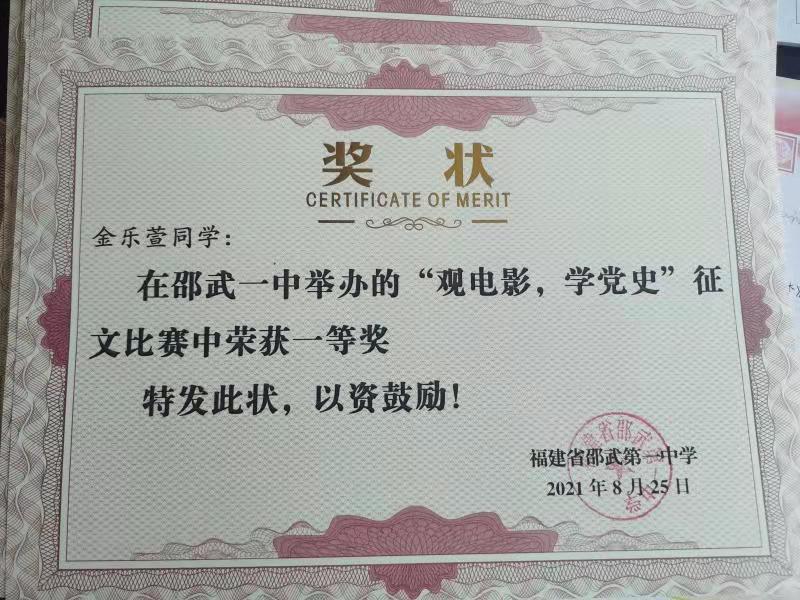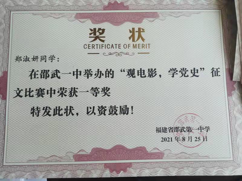 为深入贯彻落实习近平新时代中国特色社会主义思想和国务院办公厅《关于新时代推进普通高中育人方式改革的指导意见》精神,践行“求真知做真人”校训,更好地培养学生良好的思想道德素质,扎实宽厚的科学文化知知识和创造能力,健康的体魄和心理素质,正确的审美情趣和审美能力,良好的行为规范和文明礼仪,强化班级凝聚力,培养学生敢于吃苦、克服困难的精神品质,形成良好的班风、学风和校风,以促进学生健康成长和全面发展,邵武一中组织高一新生在2021年8月11日下午观看电影《建党伟业》,举办“观电影,学党史”征文比赛。要求:字迹端正,思想健康,积极向上,文风端正,感情真挚。截稿日期为8月15日。