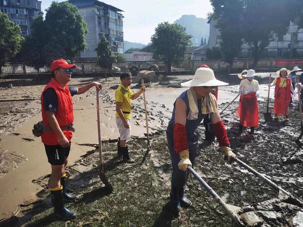 老师们不顾脏臭,趟进淤泥中挥动着铁锹、扫把等工具,争分夺秒清扫垃圾、清理地面。