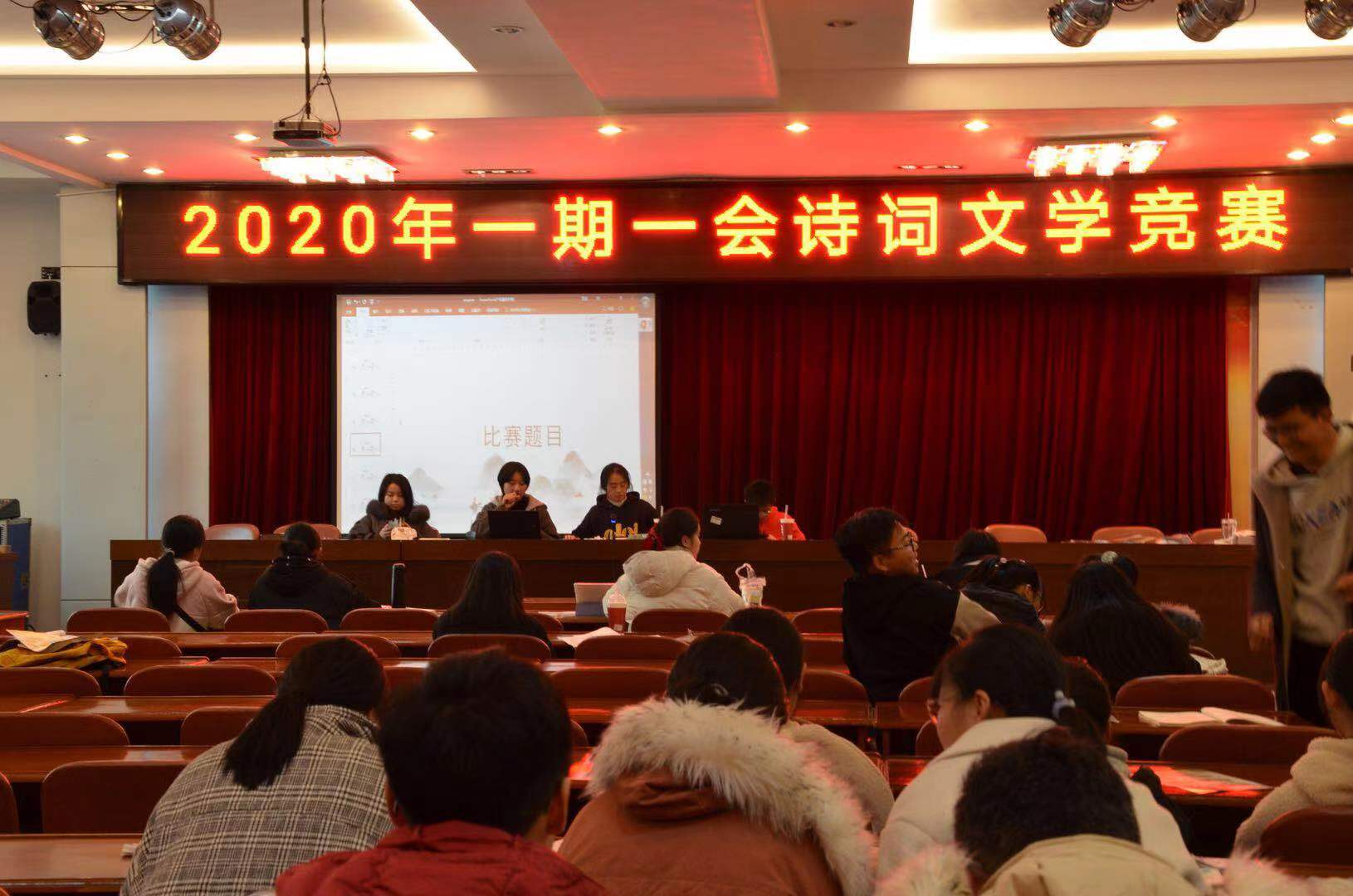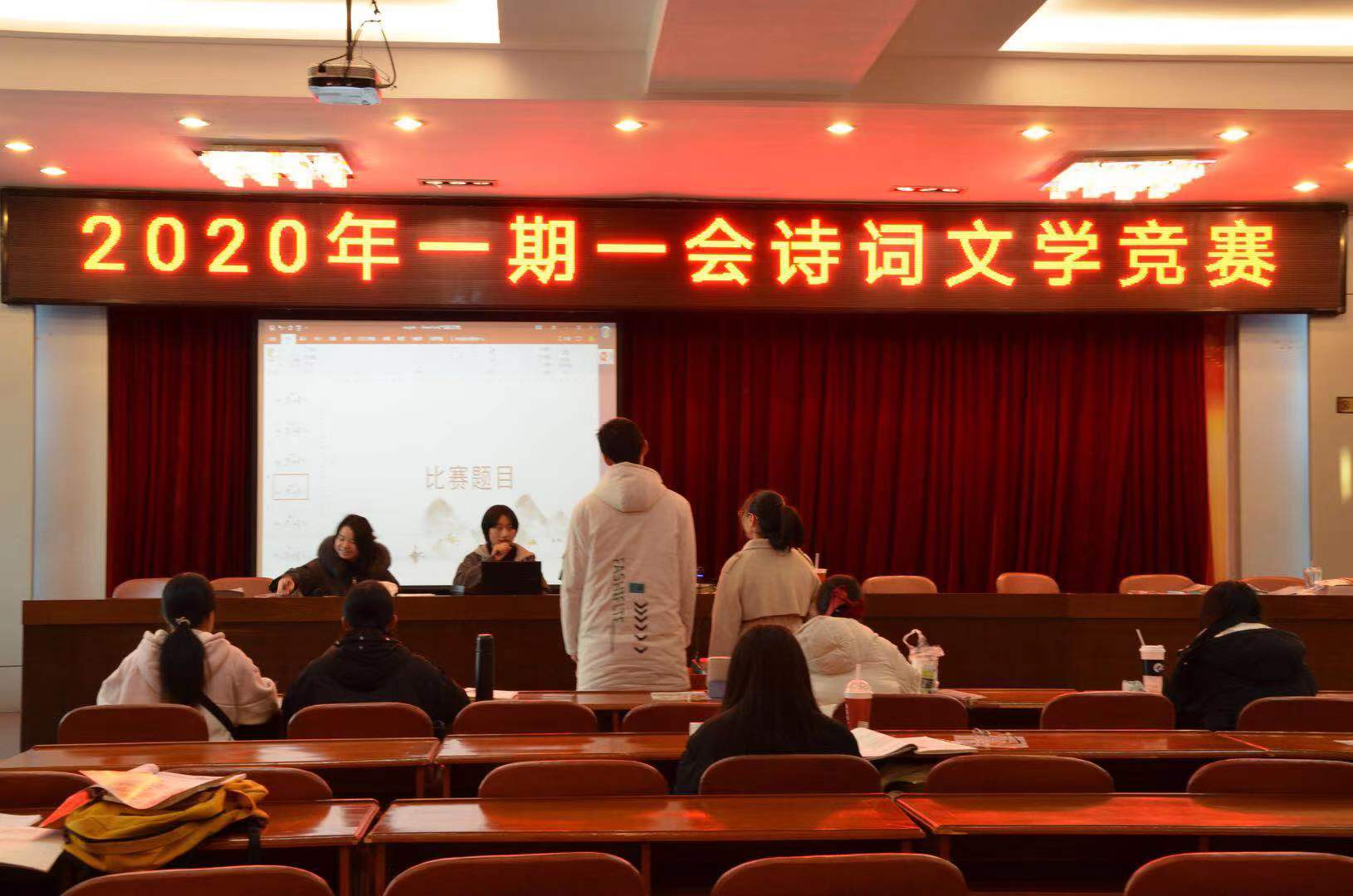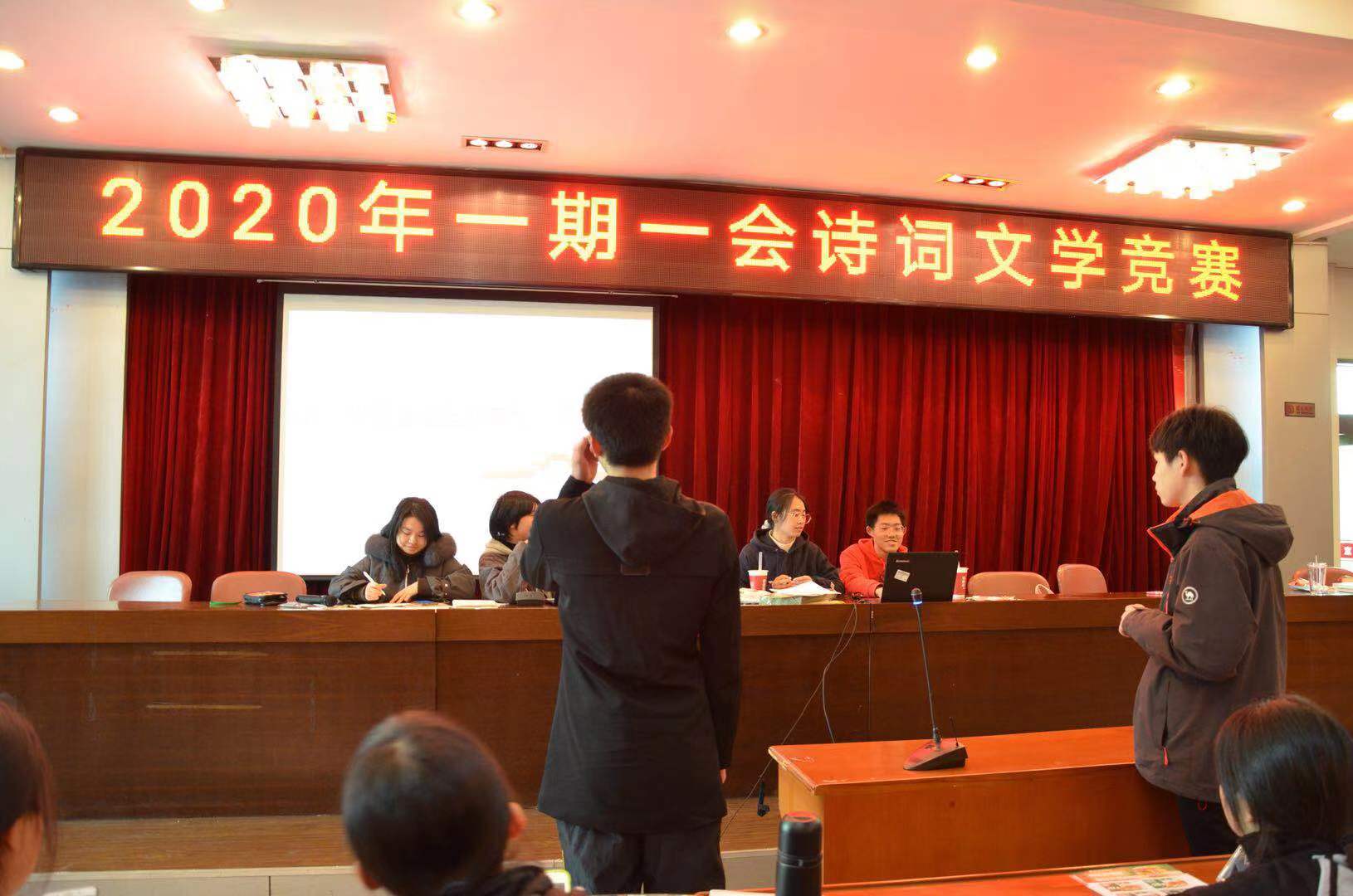 活动以传播竞赛文学文化为宗旨,博观历史穿越古今,既具历史厚重、也引领诗意柔情。活动当天,气氛融洽,松弛有度,竞争有序。在文学常识的第一轮比拼中选手们两两对立而站,以自己知识储备之广泛、诗词底蕴之丰厚,共同遨游于古人的情趣之中。主持人一声令下,题目便展示于大屏幕之上,正问道:“一门父子三词客”,台下反应灵敏的选手立刻抢过话筒自信回答道“苏轼苏洵苏辙”,目光里不光有答对题目的自豪,更多的是对这三位伟人的满满敬仰之情。“人世几回伤往事,山形依旧枕寒流”抒发了怎样的感情?“八百里分麾下炙”中的“八百里”所指何物?选手们把自己对诗句的理解娓娓道来,使同学们如沐春风。活动进行到中场休息时,文学社工作人员机智控场,以幽默有趣地“短篇小品”惹得在场的大家捧腹大笑。气氛再次被推向高潮,台上趁热打铁展开了新一轮的比赛。后期因选手的超常发挥,题库告急,工作人员紧急应对备有策略,人工出题,使比赛难度质量更有把握。至最后一局决赛轮,大家皆屏息凝神,翘首以盼,只听主持人一句“秋雨梧桐叶落时”还未完全说出口,台下便异口同声地回答上了“春风桃李花开夜”这一正确答案,台下的观众们皆为之惊叹,选手们也为彼此兴趣相通而感到欣喜。欢声笑语之中,而后优者胜,友谊第一,在场的所有同学们都给出了真诚的掌声喝彩。