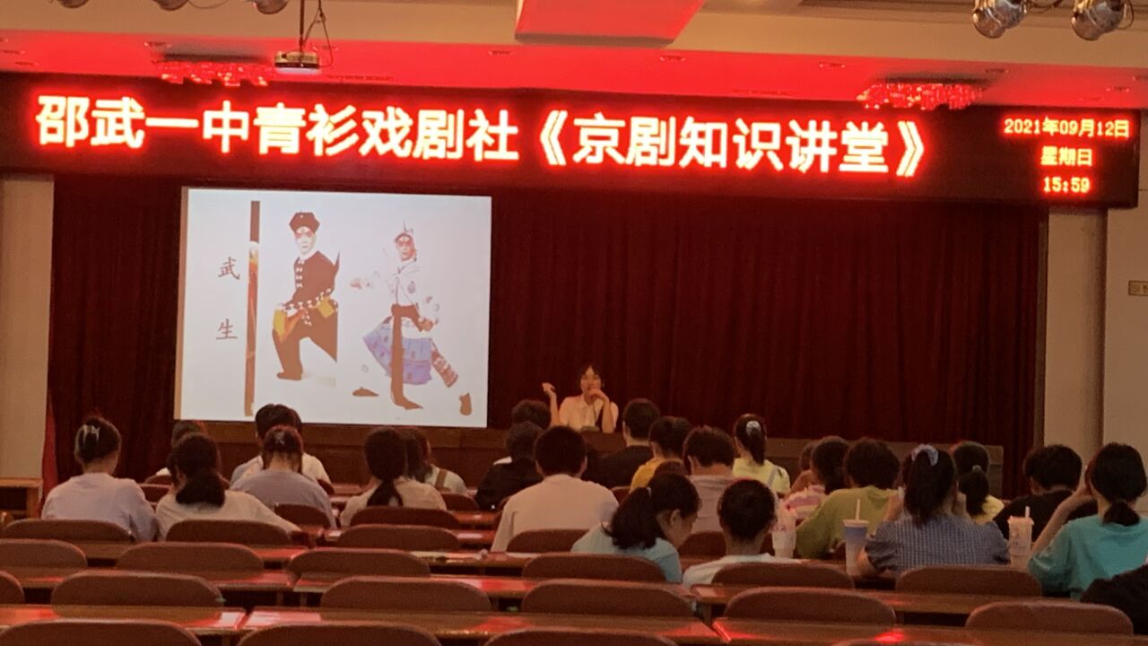2021年9月12日14时30分至16时30分,邵武一中青衫戏剧社在教职工会议室举行"京剧知识讲堂"活动,本次活动为了弘扬中华国粹,发展中国传统艺术,传承中国古典文化,把我校“京剧进校园”活动引向深入。