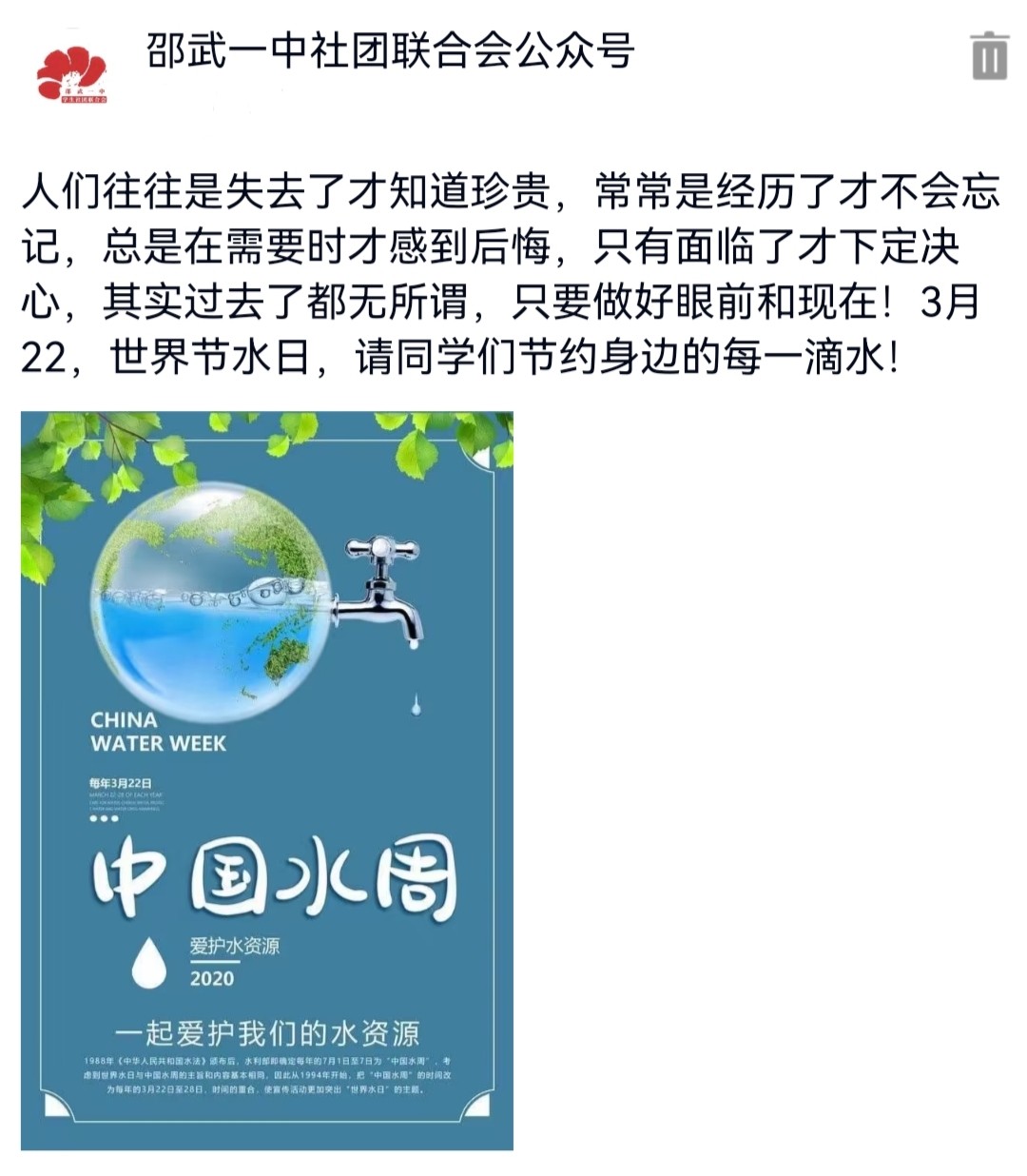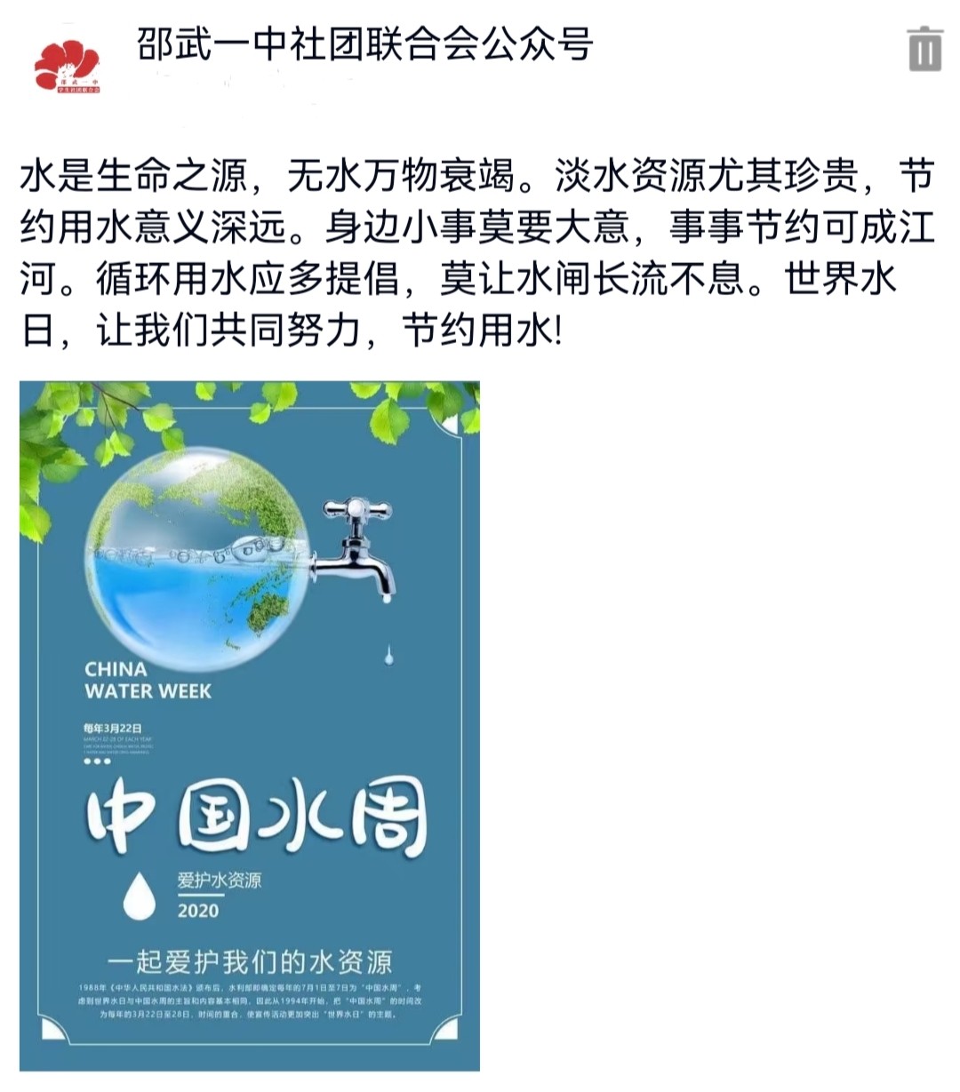 邵武一中社团联合会工作人员通过设立展板、宣传台、发放节约用水宣传单等形式,向师生广泛宣传了目前我国水资源形势、保护水资源的,必要性和重要意义,增强广大师生节约用水、保护水资源的意识,使全校形成自觉遵守水法规和珍惜水、节约水、保护水的良好风气。