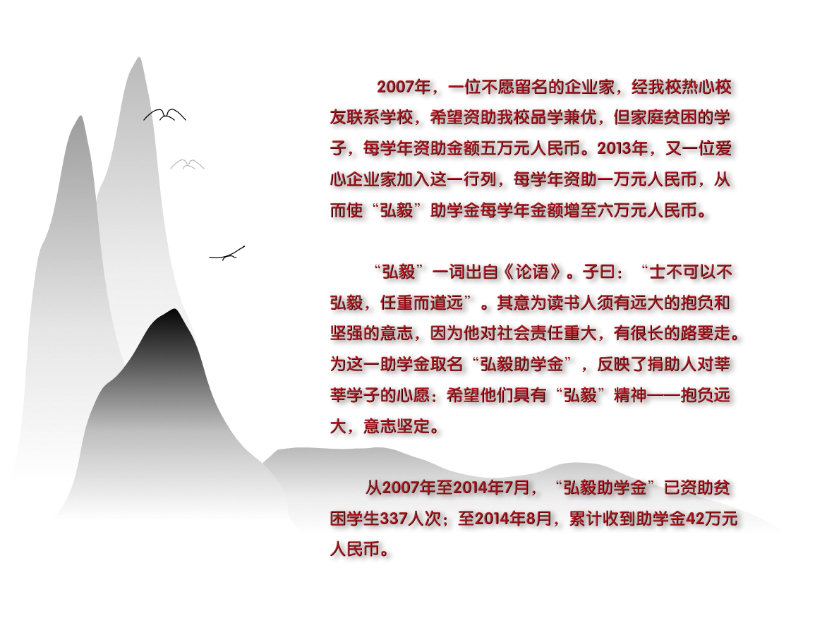国旗下讲话 流动红旗 校园文化 群星璀璨 心理教育 资助中心 家长学校 弘毅助学金简介 作者:admin 来源:本站原创 日期:2012-09-10 人气:9054 上一篇:邵武一中2012年弘毅助学金资助贫困大学生发放表 下一篇:弘毅教育基金账户 通知公告 更多 【瑞榴 • 公告】2026年福建省邵武... 【瑞榴 • 公告】2026年福建省邵武... 【瑞榴 • 公告】2026年邵武一中第... 【瑞榴 • 公告】2026年邵武一中自... 【瑞榴 • 公告】2026年福建省邵武... 【瑞榴 • 公告】2026年福建省邵武... 最新动态 更多 【瑞榴 • 社团活动】传承非遗文脉... 【瑞榴 • 优秀校友】情系母校 反... 【瑞榴 • 安全】筑牢安全防线,... 【瑞榴 • 团建】铭记千秋功勋,... 【瑞榴 • 社团活动】暖心相伴,... 【瑞榴 • 学生活动】千年傩舞进校... 【瑞榴 • 教研】研思共进,赋能课... 【瑞榴 • 党建】“党纪铸魂守初心... 【瑞榴 • 近视防控】瑞榴润心 守... 【瑞榴 • 安全】防毒护苗,青春无...