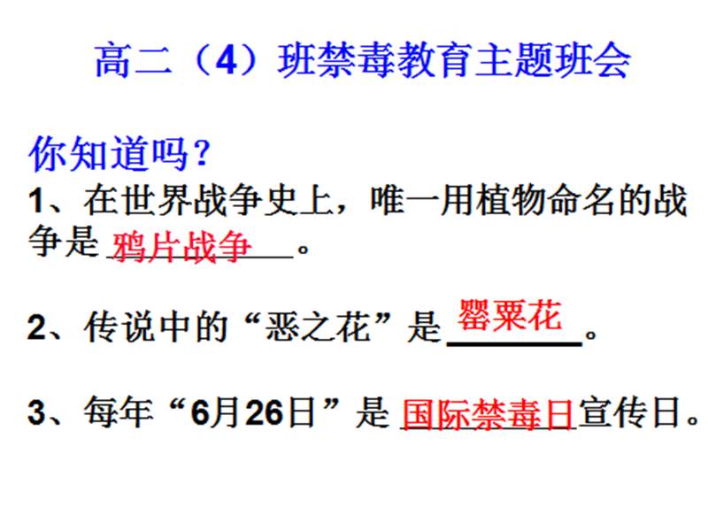 每年6月26日的国际禁毒日,本次活动旨在通过主题班会的形式,结合图文并茂、通俗易懂的图片和故事使学生了解有关毒品的常识、充分认识毒品的危害,增强自觉防范及抵制能力、提高拒毒防毒意识,从而防微杜渐、远离毒品、塑造美好人生;通过多媒体辅助教学,展示有关毒品和吸毒者的悲惨图片,并结合案例分析,帮助学生更加真实地了解毒品的危害,受到心灵的震撼,从而自觉地树立“珍爱生命,拒绝毒品”的意识。