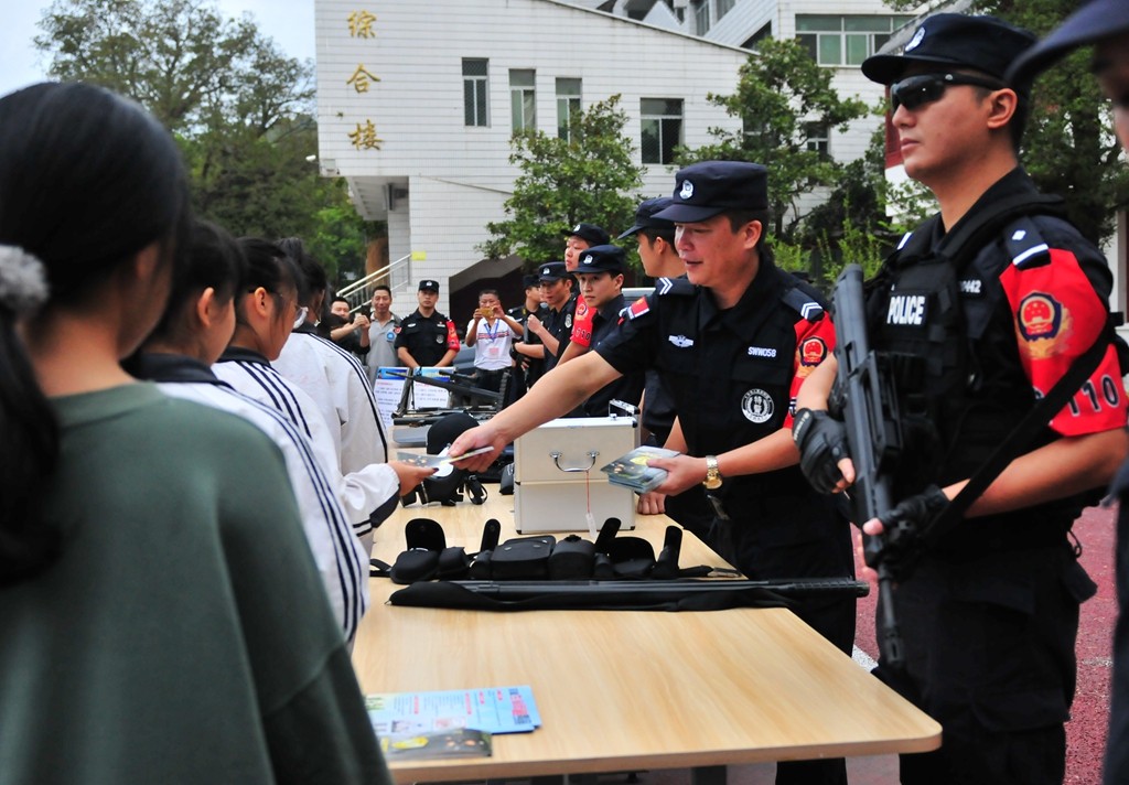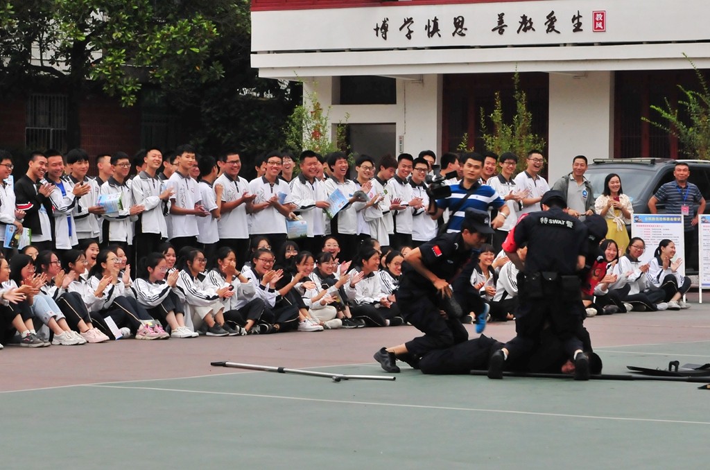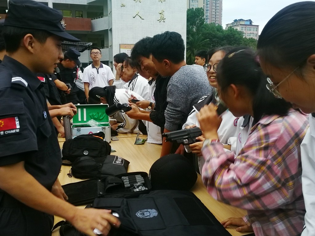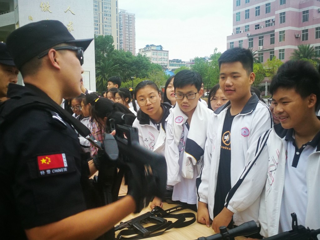 10月14日下午4:30,邵武市公安局巡特警反恐大队干警一行十余人到我校开展“特警在身边、安全进校园”安全主题宣传活动。干警们首先是通过LED屏播放由国家反恐办制作的反恐防范应急动漫视频、现场发放宣传手册,进行《反恐法》的宣传教育;然后是干警的反恐防暴实景演练,他们过硬的军事素质和高超的特战技能博得了师生们阵阵掌声。最后是特警队员的器械装备展示和使用演示更加吸引师生们眼球,激发了师生们的浓厚兴趣。