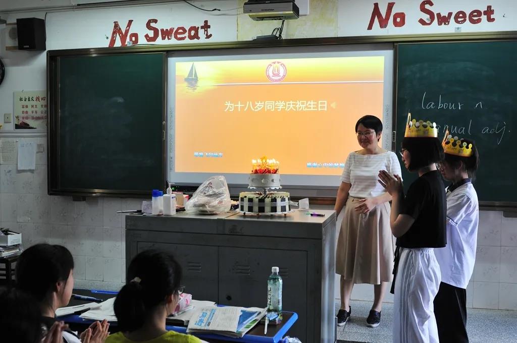 首先,班主任组织学生观看《十八岁的誓言》视频,引发学生强烈的共鸣,十八岁是勤奋、是激情,十八岁是梦想与责任,角色的转变,思想的深化,在这最美好的年纪,绽放最灿烂的微笑,书写最美妙的篇章;十八岁,少不了祝福与掌声,一首生日快乐歌响起,生日代表们点上蜡烛,一支支闪亮的蜡烛像一颗颗跳动的心,蛋糕上布满方块,方块上每一位同学的名字是那么的醒目,一个蛋糕象征一个团结的集体,心因集体而精彩,集体因心而自豪,每一位学生许下虔诚的心愿,在掌声与祝福中弥漫喜悦之情。