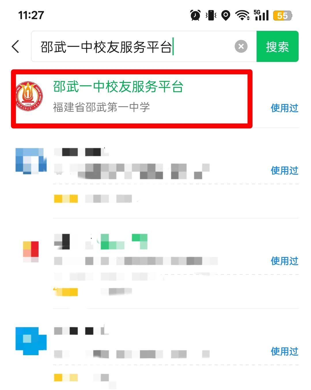 在顶部搜索框中输入“邵武一中校友服务平台”进行搜索。